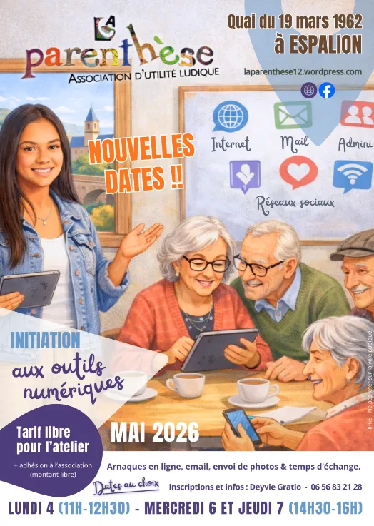 Ateliers d’initiation aux outils numériquesla parenthèseQuai du 19 mars 196212500 Espalion lat. 44.5229 - lon. 2.76202 Obtenir l'itinéraire
