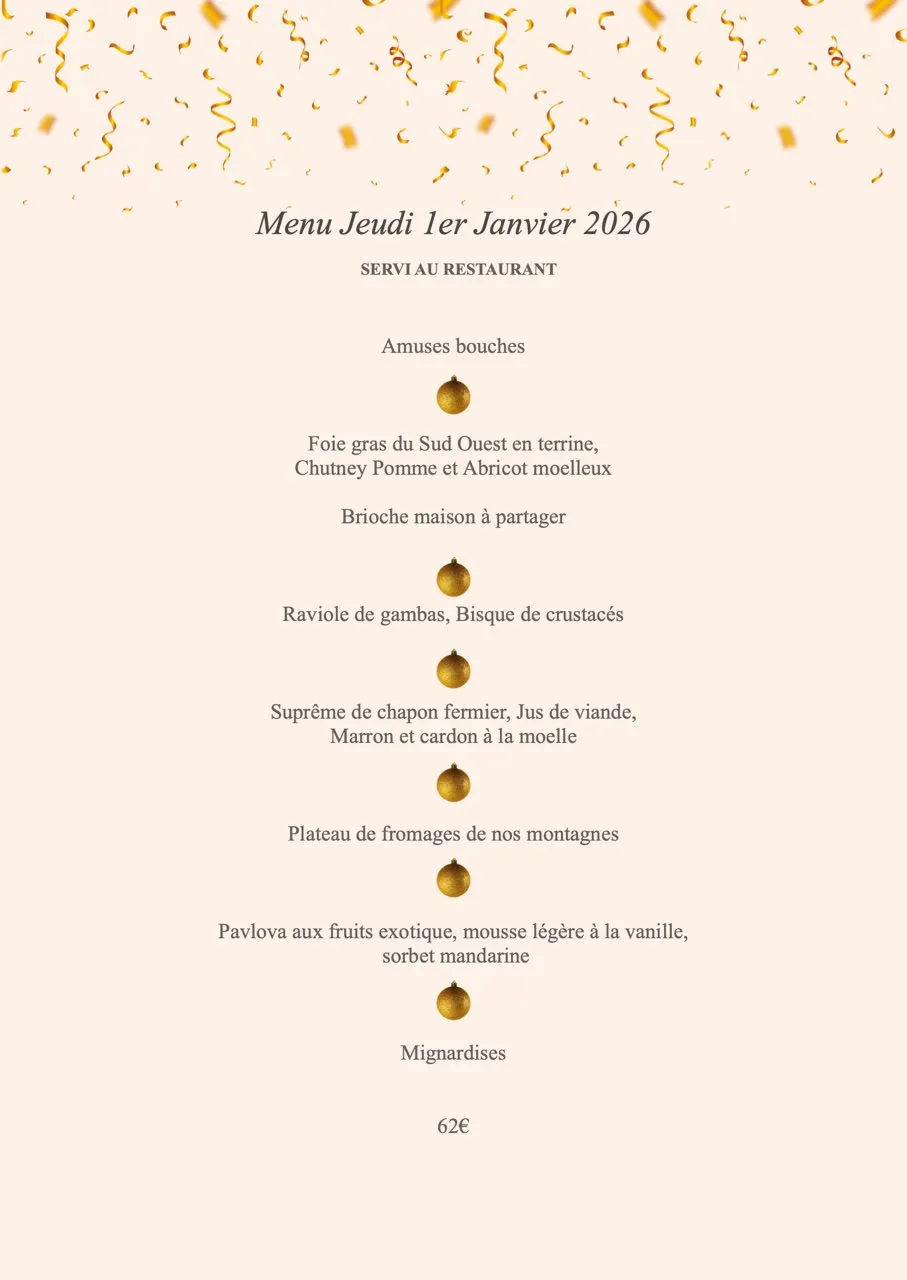 Menu des fêtes au restaurant Le Moulin d'AlexandreLe BourgRue de la Traverse12130 Sainte-Eulalie-d'Olt lat. 44.4645 - lon. 2.9455