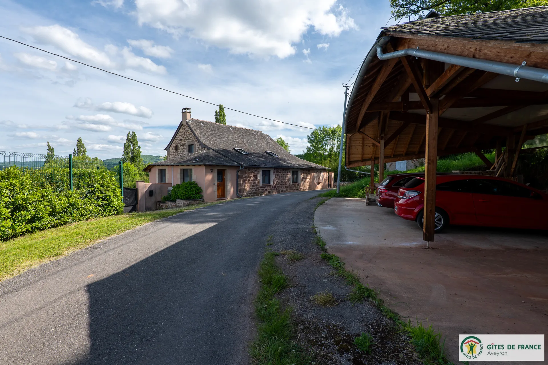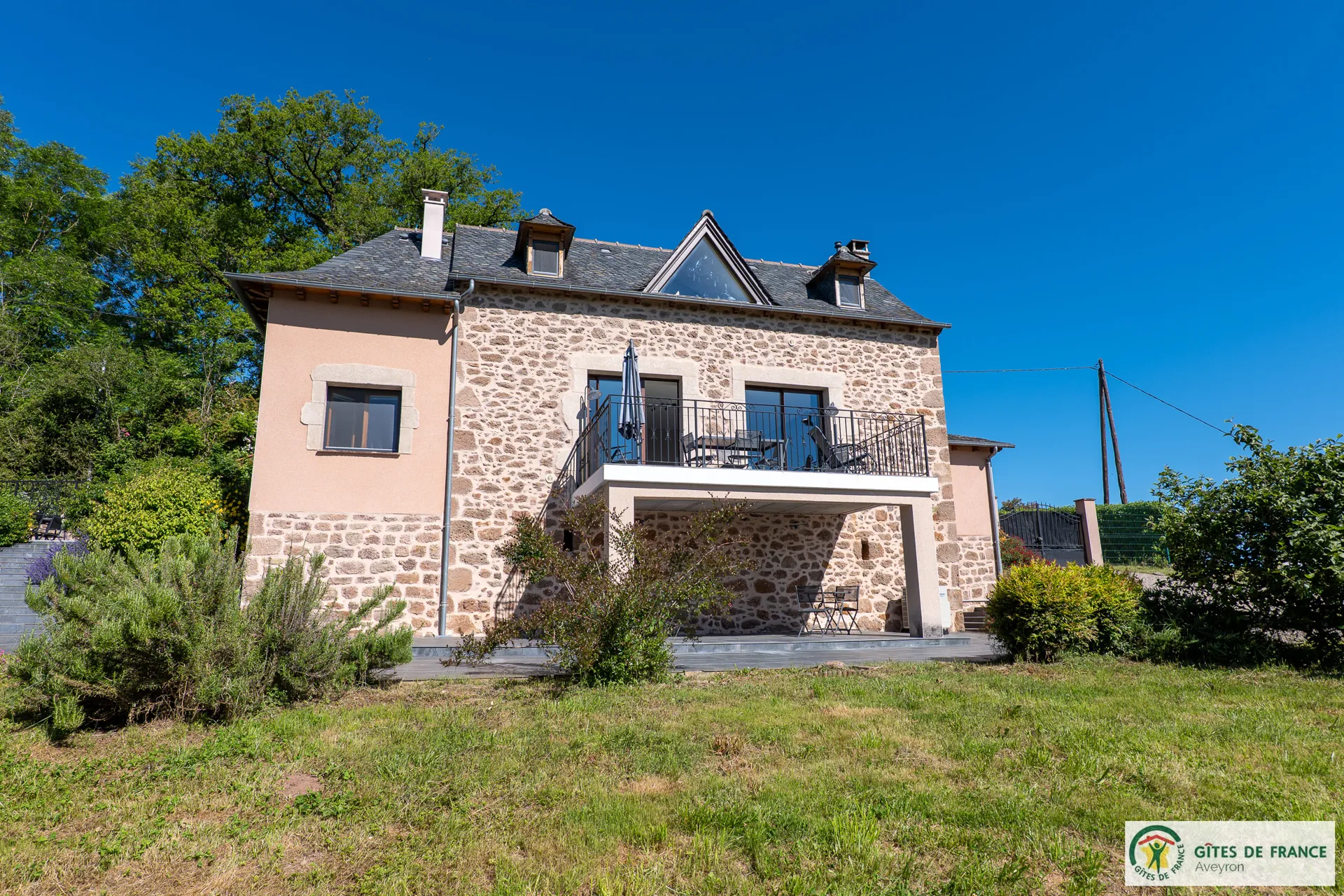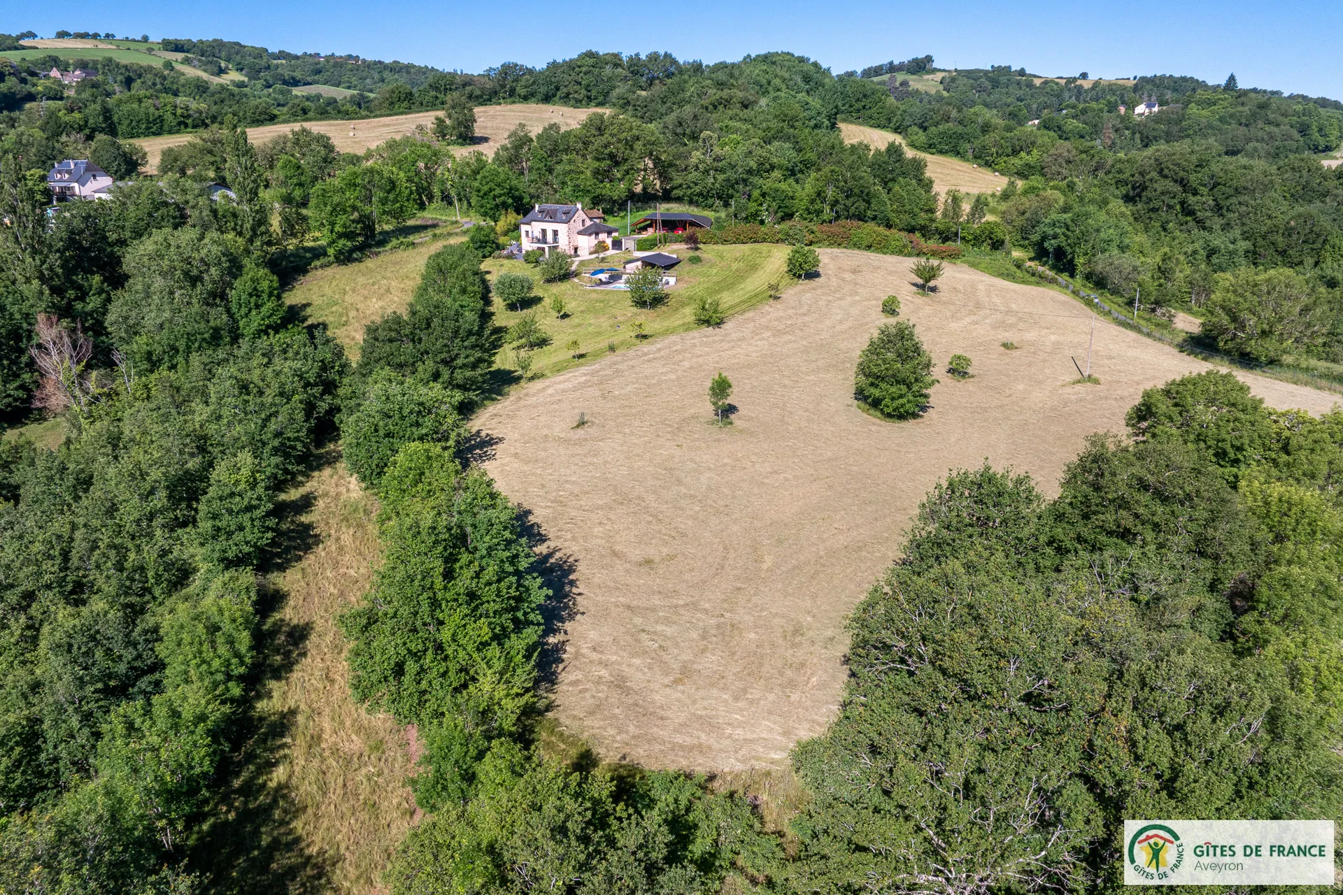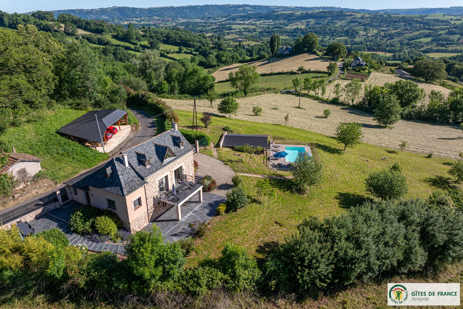 Independent cottage, of 130m2 with reversible air conditioning and private swimming pool enjoying a magnificent view. Not far from a hamlet, in the countryside 15 km from Conques, between the Vallon de Marcillac and the Lot Valley. 3 bedrooms (3 beds 160 and 1 bed 90), 2 shower rooms and 1 bathroom, fully equipped kitchen (induction hob, electric oven and M-W, fridge-freezer, dishwasher...), living room/dining room (sofas, television, wood stove), electric heating, laundry (washing machine, dryer), 2 private unenclosed terraces of 60m2 each, 1 enclosed terrace (14m2), private enclosed land (1 ha 50), private heated (from mid may to mid-september) swimming pool (8x4) , private covered carport for 3 cars, patio furniture, BBQ, bicycle room, electric charging station (paid service: 20 eurocents / kw)