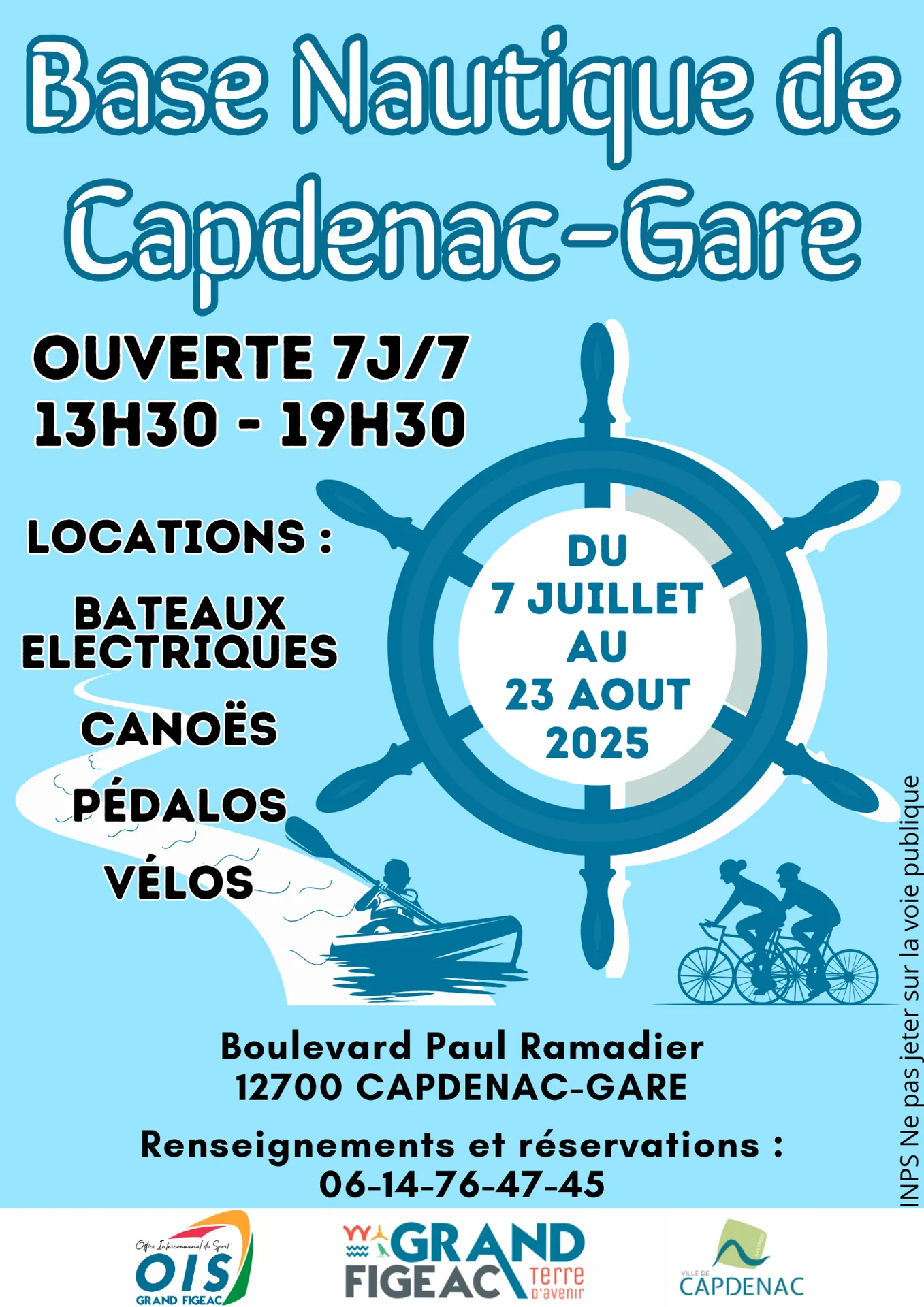 Come sail and pilot the boats yourself!Electric boat trips on the Lot River; various models available (children can drive accompanied by an adult).Pedal boat rentalCanoe rentalStand-up paddleboard rental.Mountain bike/hybrid bike/electric bike rental by reservation.Play area and picnic tables on site.Soft drinks, coffee, and ice cream available for purchase.