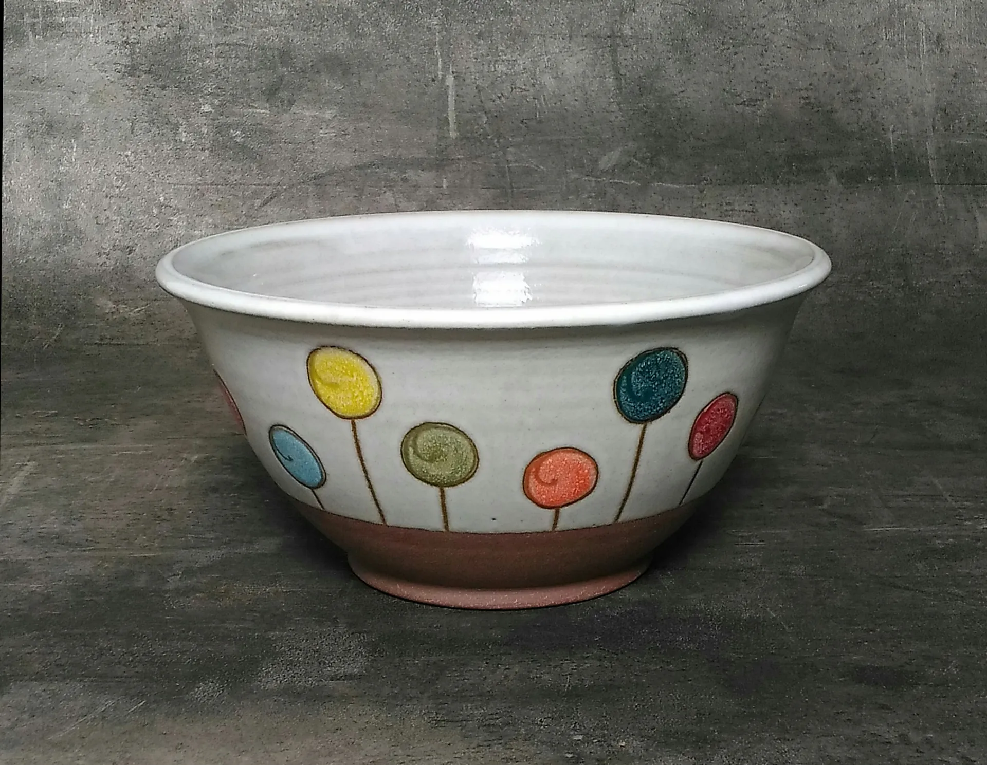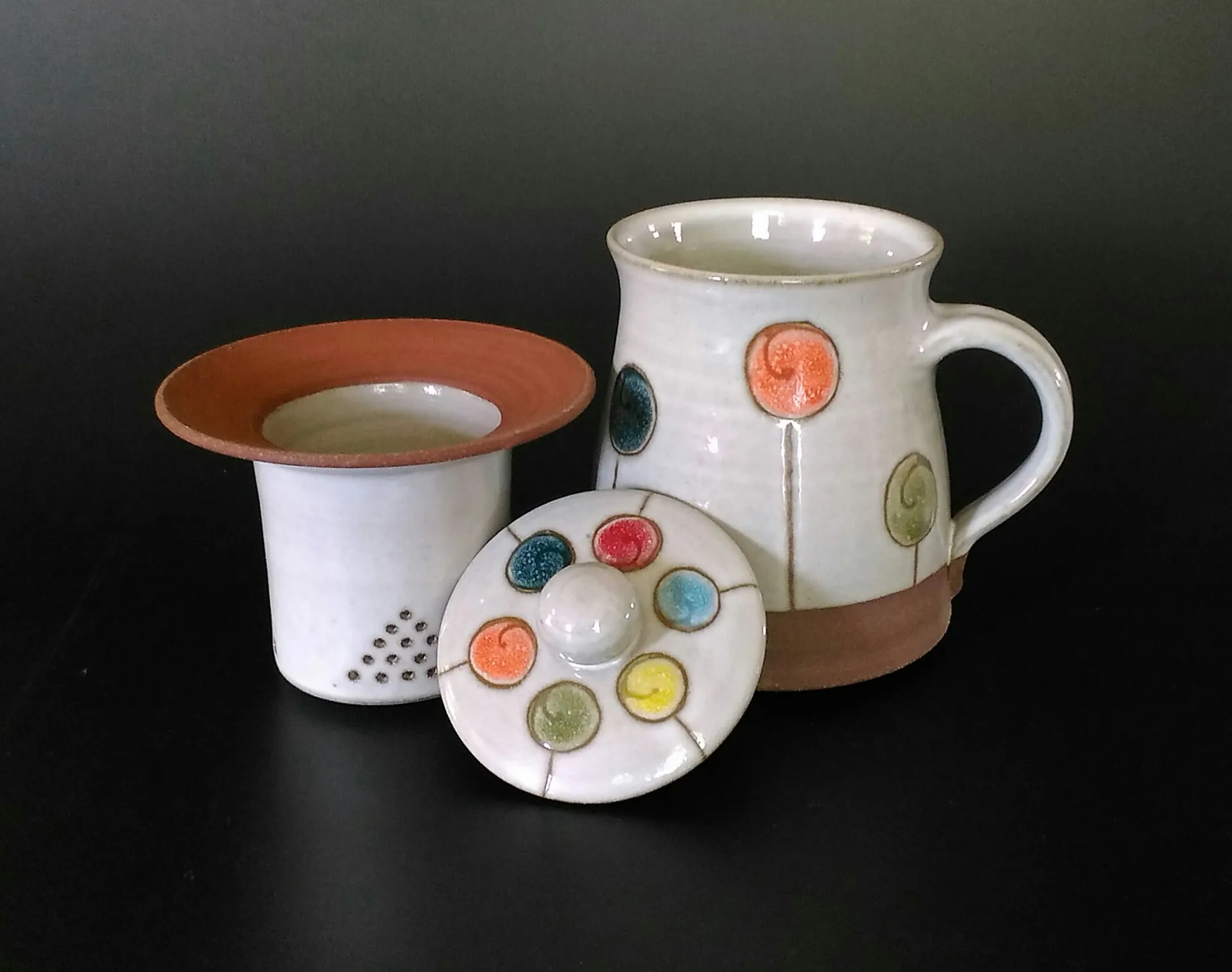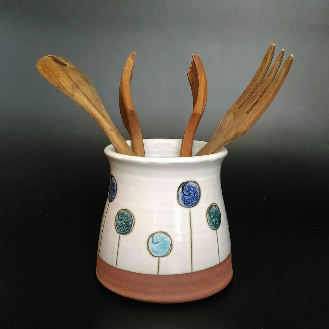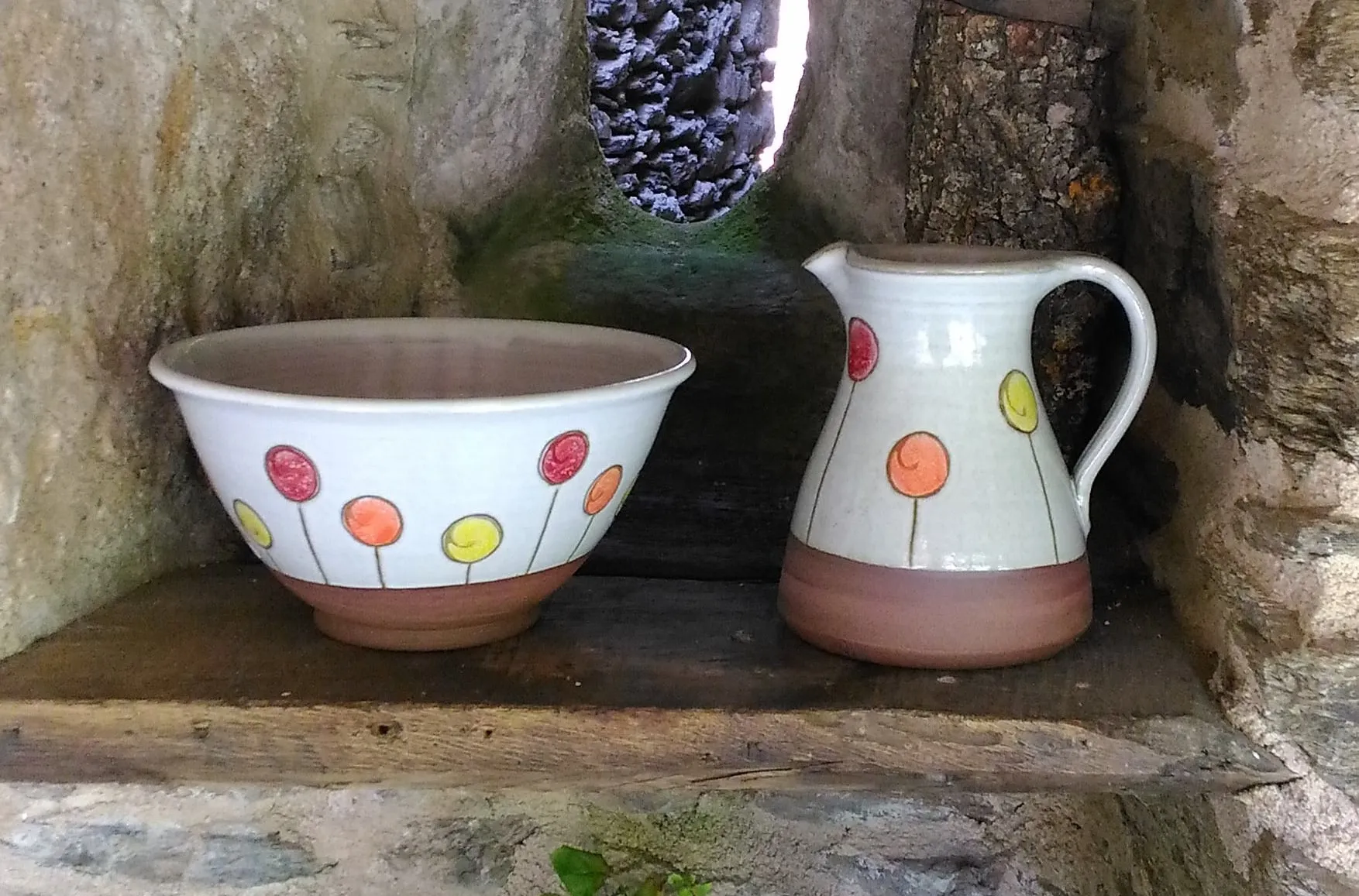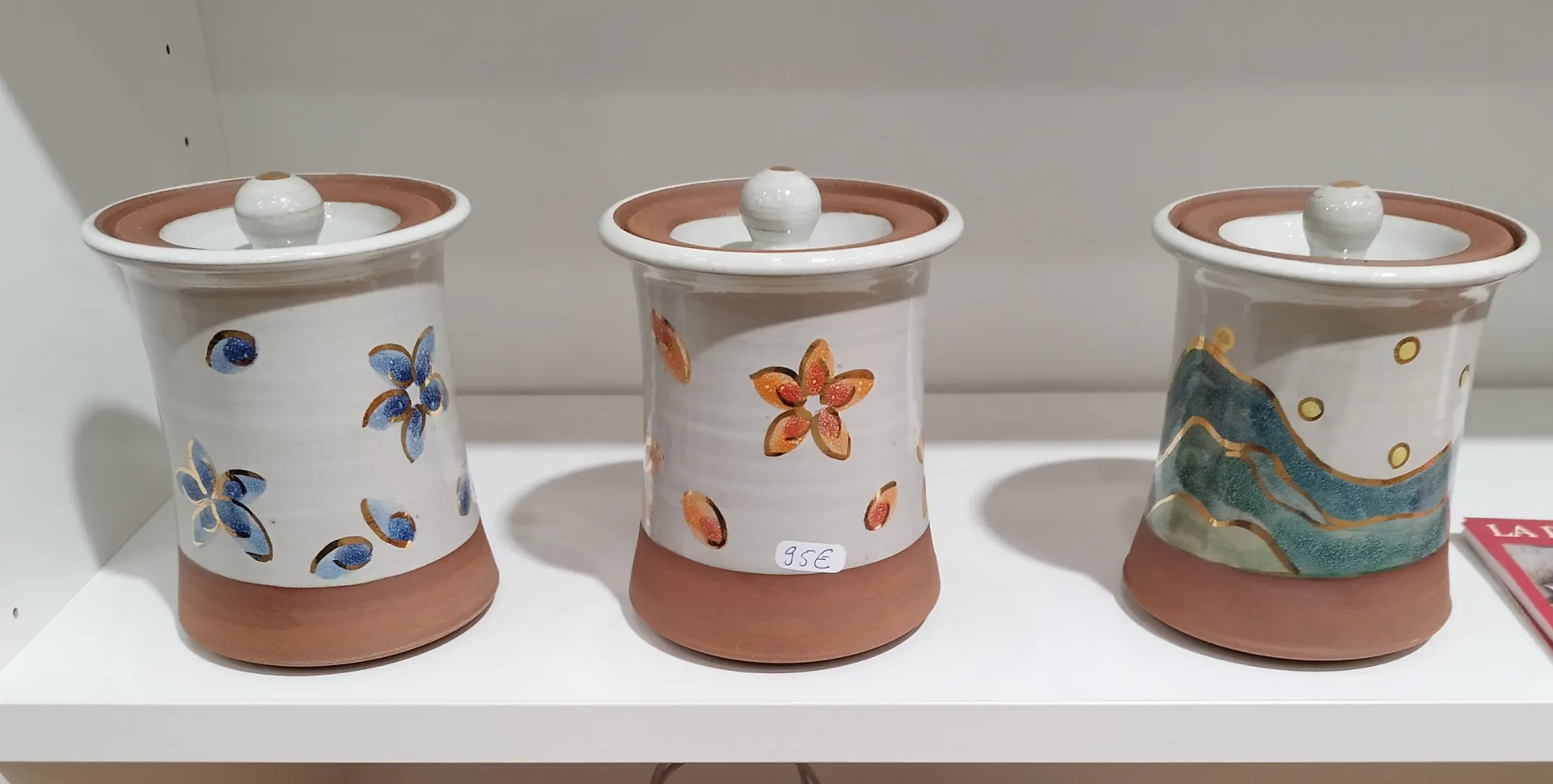 Christine Grave le propone una amplia gama de cerámicas culinarias como cuencos, jarras, platos aptos para horno y mucho más. El esmalte blanco crea un bonito contraste con la gres marrón. Su trabajo es reconocible en particular por las decoraciones de colores alegres y motivos variados, aunque también ofrece una línea muy sobria.