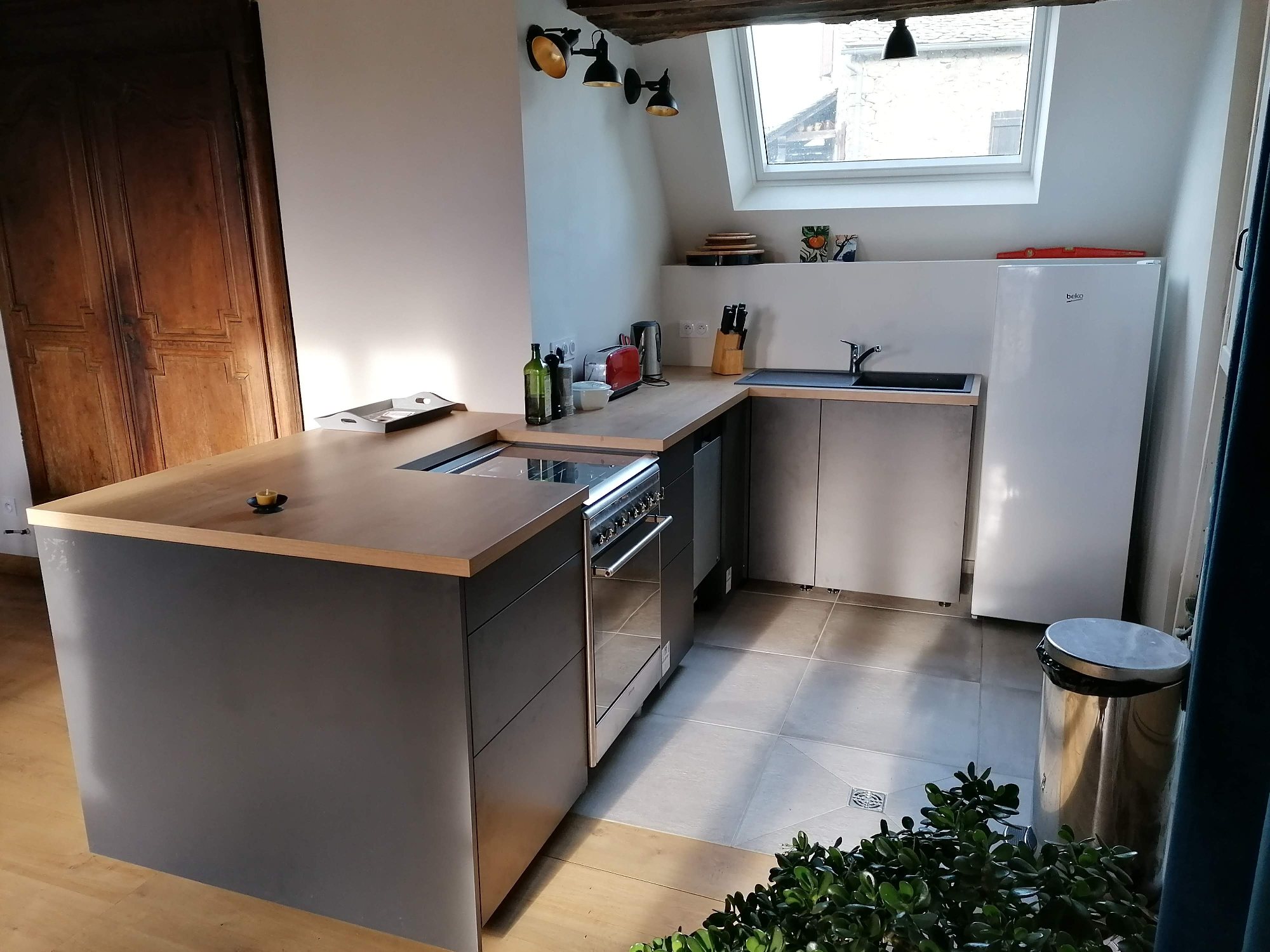 Se entra en una sala grande y agradable de 50m2 con salón y mesa de comedor. Se ha instalado una nueva cocina y una estufa de leña. Esta habitación tiene 2 armarios antiguos originales. La escalera conduce a 2 dormitorios, un cuarto de baño con ducha y bañera y un aseo separado.