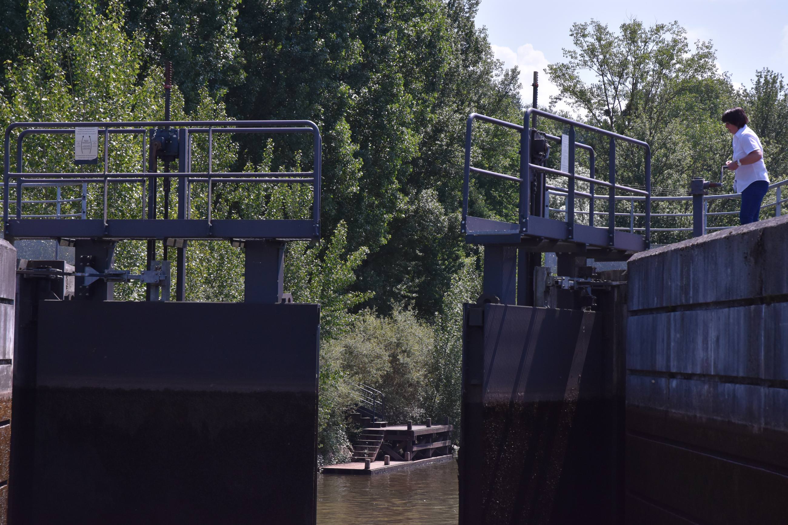 La guide-matelot est maintenant sur la paroi de l’écluse. Elle actionne les grosses portes et le bateau s’engouffre à l’intérieur.