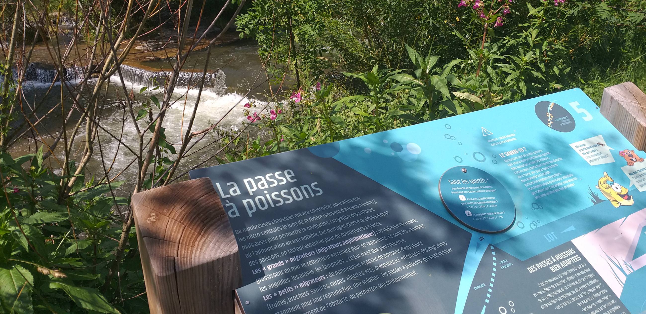 Une promenade digestive s’impose. Nous suivons là aussi les précieux conseils de Pascale : le parcours « Les rives d’Olt », un itinéraire de découverte de la rivière. Nous partons pour 3 km d’un circuit familial, d’une rive à l’autre du Lot ! Les mascottes Gloops et Charlotte seront nos guides d’un jour, et le Lot n’aura plus de secret pour nous : faune, flore, eaux lentes ou vives, la loutre et l’écrevisse, sans oublier les nombreuses espèces de poissons qui peuplent la rivière. Nous allons d’un panneau à l’autre, les énigmes, quizz et jeux captivent les enfants qui observent attentivement les trésors du Lot.