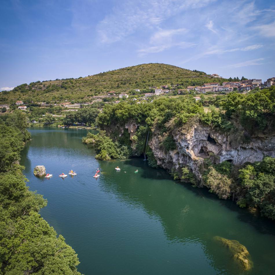 Quelques nouveaux coups de pagaie, on entend enfin la chute d’eau dans le Tarn et les clameurs des baigneurs surpris par la fraîcheur de cette majestueuse cascade. La magie de ce spectacle de 18 m de haut accroît notre sensation d’être dominé par cette nature omniprésente.