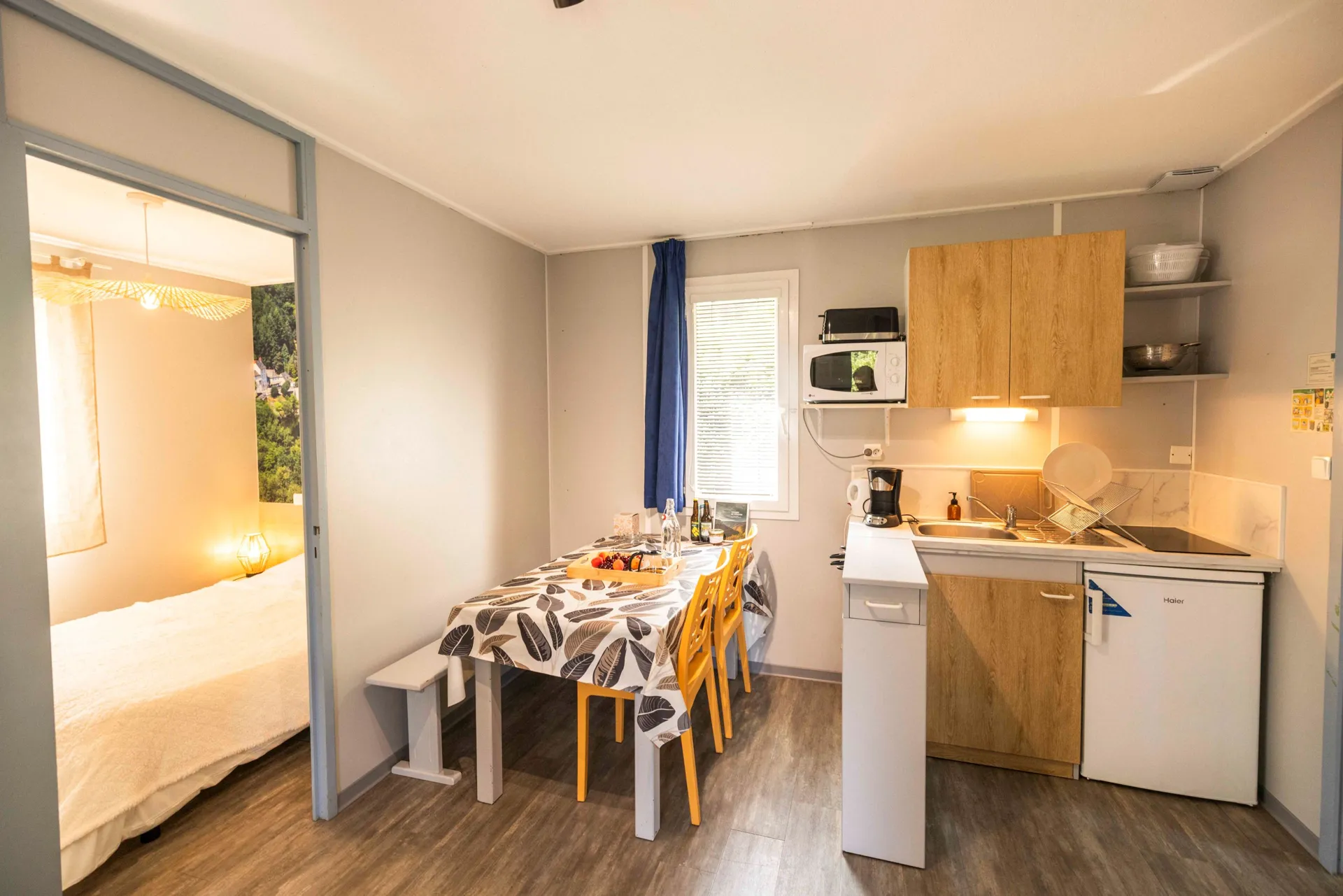 RDC : Cuisine / Salle de séjour (canapé-lit), 2 chambres (1 lit 140 - 2 lits 80), Salle d'eau, WC, Terrasse couverte, Salon de jardin, Pelouse, Chauffage électrique, Parking. 1 chalet handicapé. Draps fournis.