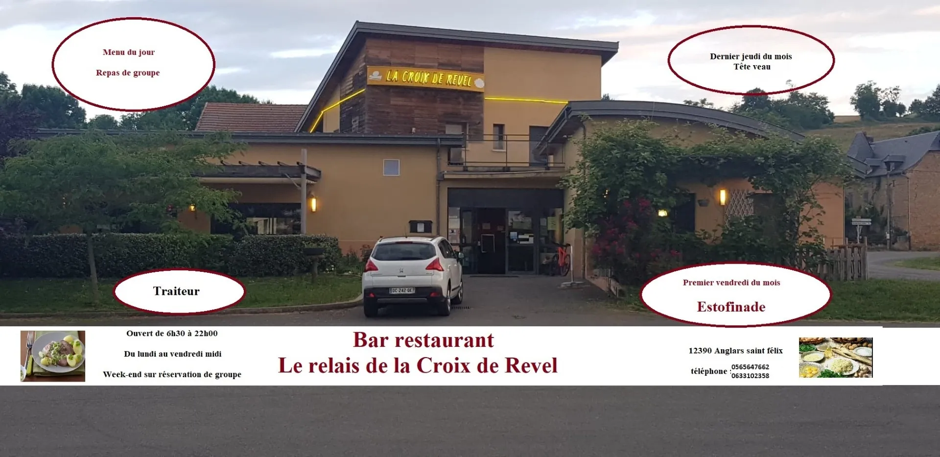 Bar restaurant routier, cuisine traditionnelle,Buffet d'entrées,desserts maisonRestaurant de cuisine traditionnelle et de spécialités de poissons. En plein coeur de l'axe Rodez/Villefranche-de-Rouergue c'est une étape idéale pour les groupes avec son grand parking pour poids lourds ou autocars. La salle climatisée dispose de 90 places modulables, avec toilettes pour personnes à mobilité réduite. Le restaurant dispose également d'une terrasse.