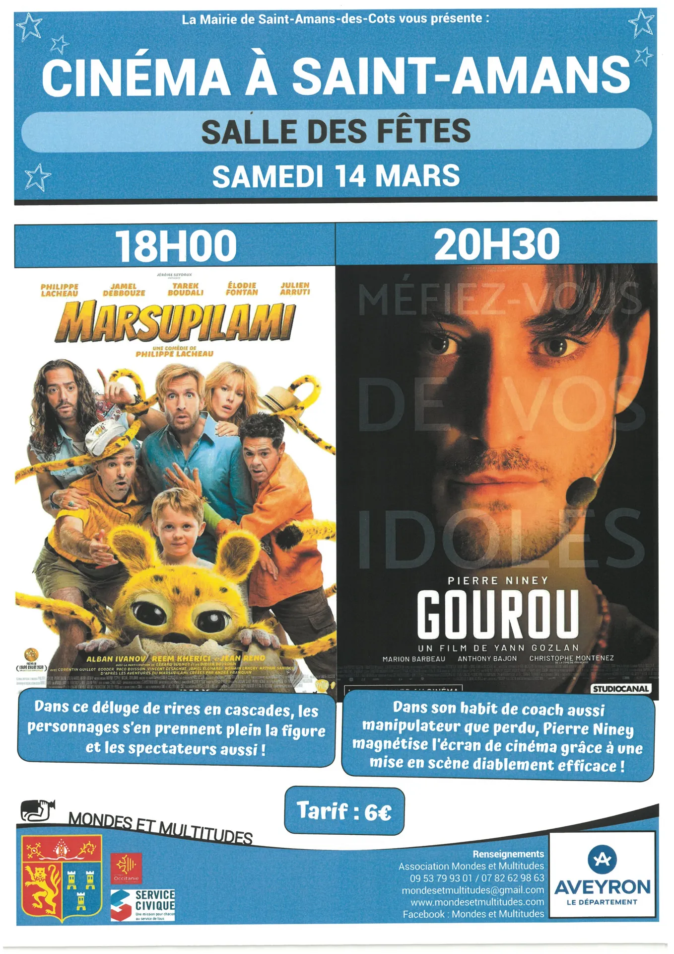 Samedi 14 mars, 2 séances de cinéma à la salle des fêtes de Saint-Amans-des-Côts. A 18h : Marsupilami (1h39), à 20h30 : Gourou (2h06).