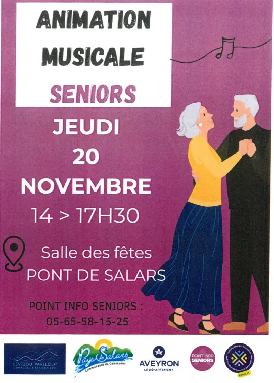 14h à 17h30 - Salle des Fêtes. Animation musicale pour les Séniors organisée par le Point Info Séniors. Renseignements et inscription au 05 65 58 15 25 ou au 06 75 73 33 57.