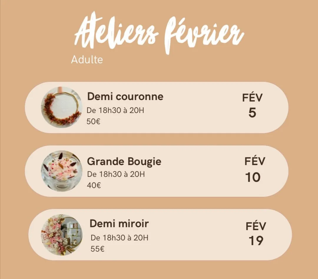L'atelier d'Artisanat floral by Camille propose des ateliers pour adultes. En duo, en groupe, entre collègue, entre amies….