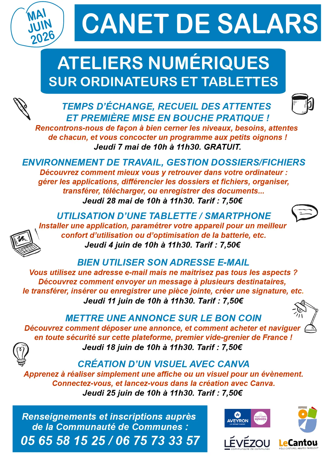 10h à 11h30. Atelier numérique sur ordinateurs et tablettes animé par le Cantou. Temps d'échange, recueil des attentes et première mise en bouche pratique. Gratuit. Renseignements et inscription au 05 65 58 15 25 ou 06 75 73 33 57.