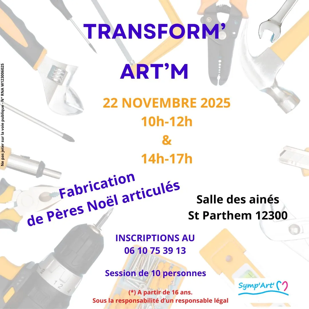 Salle des aînés 10h à 12h et 14h à 16hFabrication de Pères Noël articulés (petite menuiserie et mise en peinture). Limité à 10 participants. Dès 16 ans (sous la responsabilité d’un adulte).Inscription obligatoire asso Symp’Art’m 06 10 75 39 13