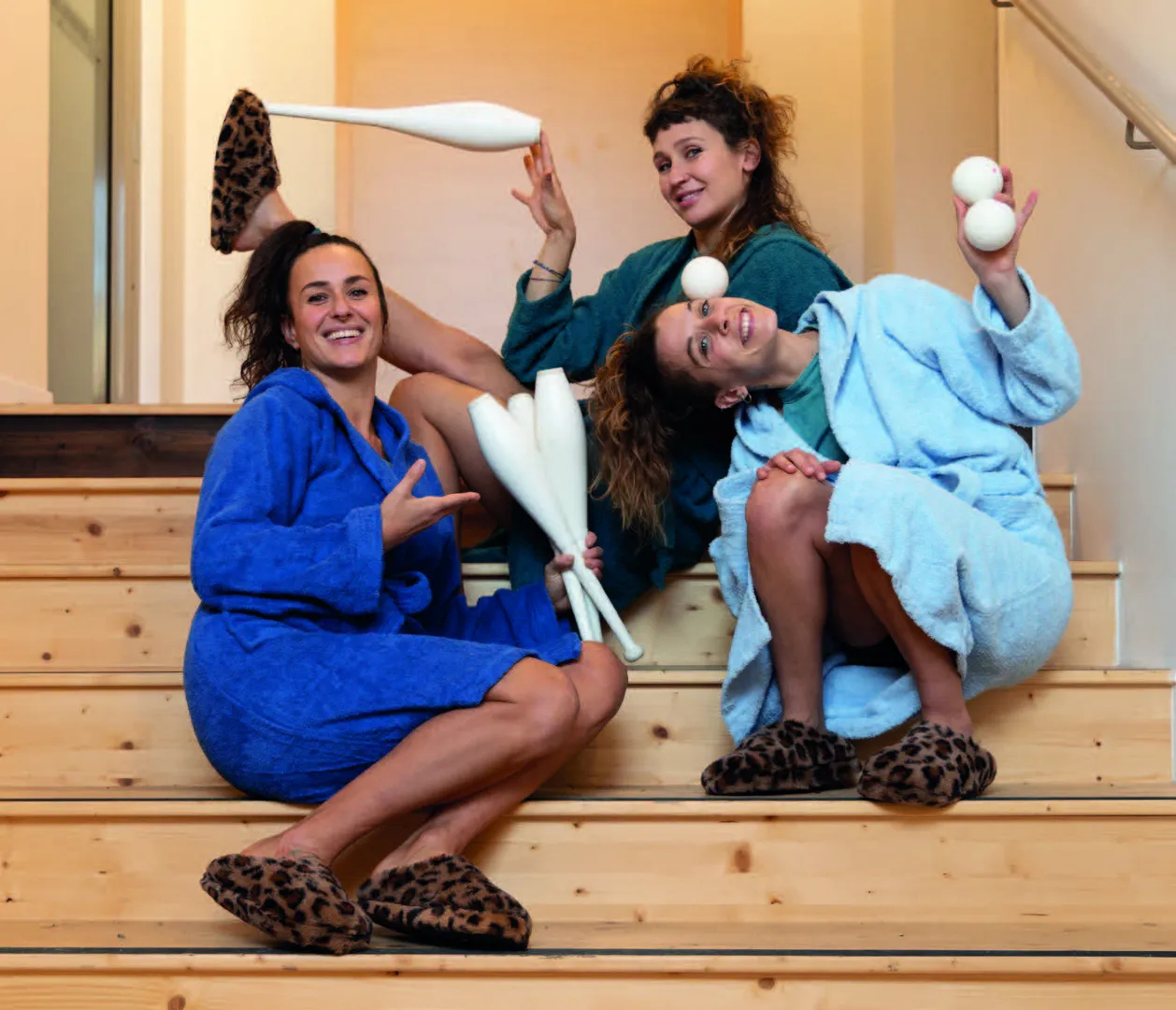 Attention à ta tête est un spectacle de jonglage drôle et décalé avec 3 filles et une baignoire.
