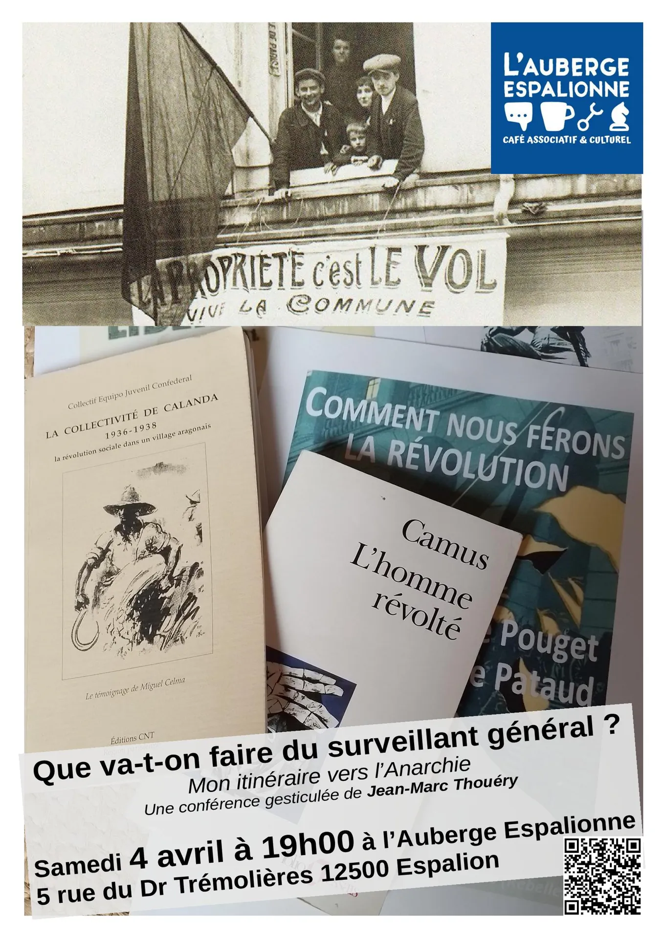 Invité par l'Auberge Espalionne, Jean-Marc Thouéry retracera son itinéraire vers l’anarchie, depuis ses premières révoltes adolescentes jusqu’à une réflexion approfondie sur cette idéologie fondée sur les principes de démocratie directe et d’autogestion.