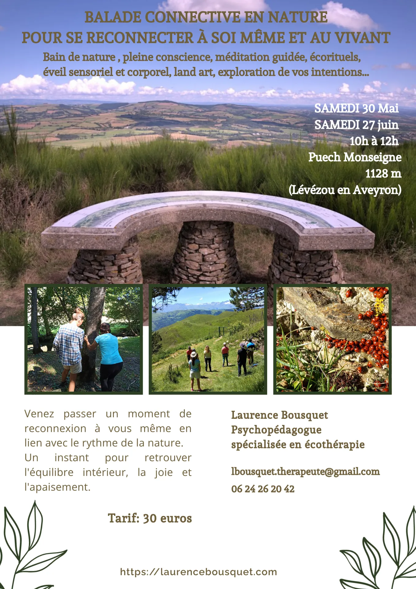 10h à 12h - Au Puech Monseigne. Bain de nature, pleine conscience, méditation guidée, éco rituels, éveil sensoriel, land art. Animé par Laurence Bousquet, Psychopédagogue, spécialisé en écothérapie. 30€ sur réservation au 06 24 26 20 42.