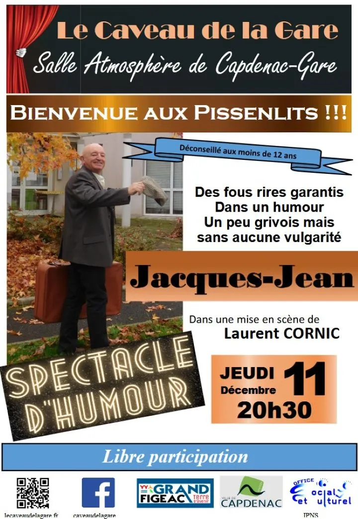 "Le Caveau de la Gare organise un nouveau spectacle. Après l’énorme succès de son dernier spectacle "Youpi, ma femme est morte", Jacques-Jean est de retour avec un tout nouvel opus du rire "One man Chauve", intitulé "Bienvenue aux Pissenlits" !