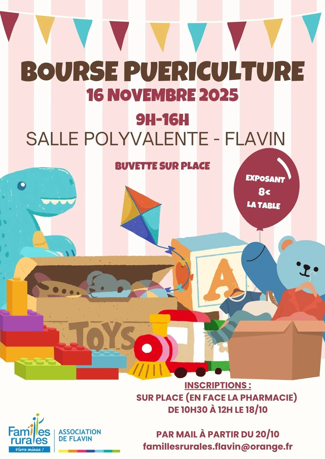 9h à 16h - Salle Polyvalente. Bourse aux jouets organisé par Familles Rurales de Flavin. Exposant 8€ la table (inscriptions par mail famillesurales.flavin@orange.fr). Buvette sur place.