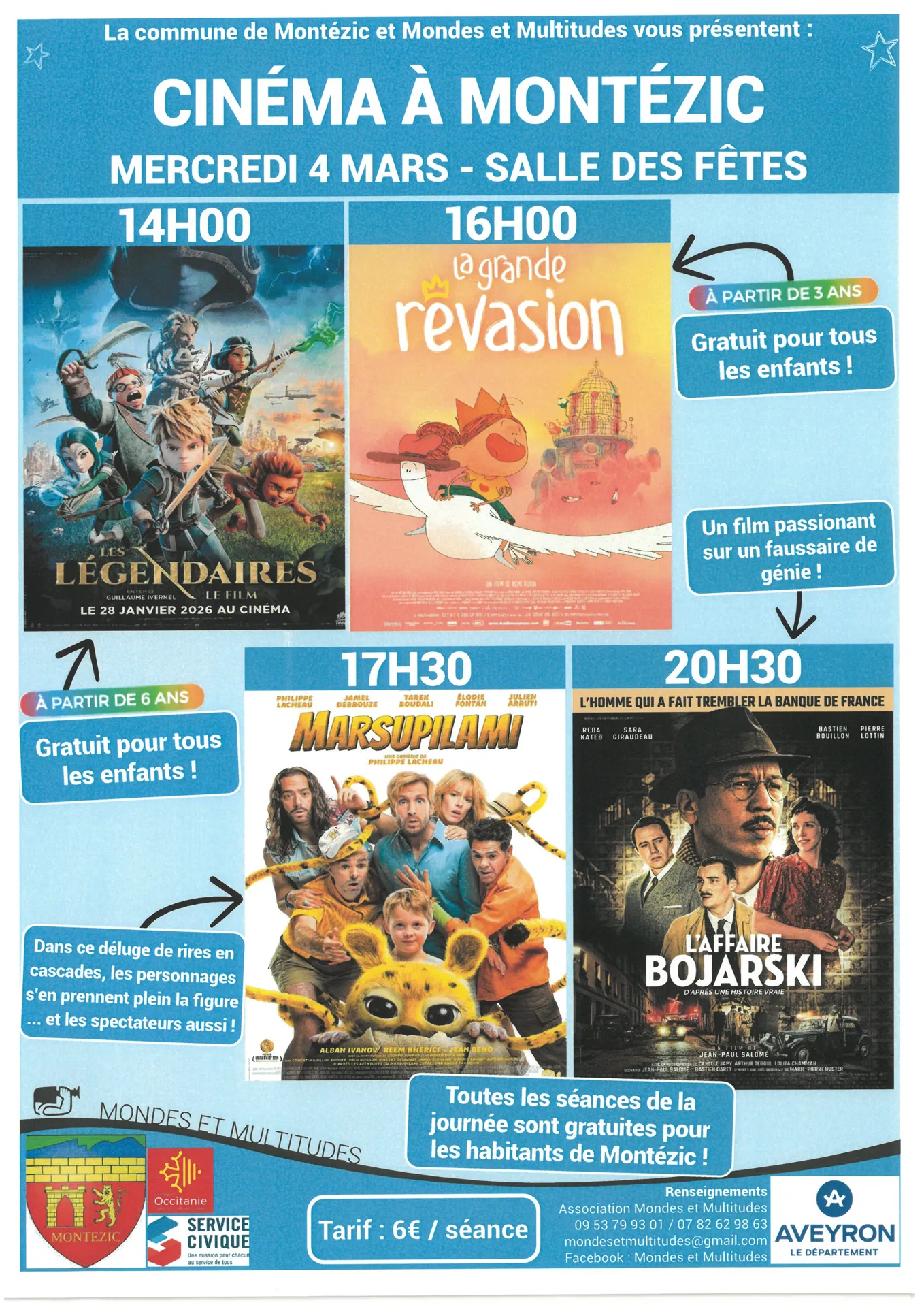 A la salle des fêtes, à 14h : Les légendaires, 1h32 (à partir de 6 ans) et à 16h : La grande Rêvasion, 45min (à partir de 3 ans).