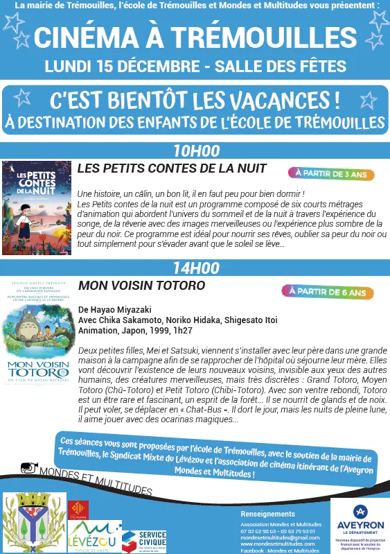 Salle des fêtes. À 10h, Les Petits contes de la nuit (à partir de 3 ans) et à 14h, Mon voisin Totoro (à partir de 6 ans). Séances proposées par la Mairie de Trémouilles, l'école de Trémouilles, le Syndicat Mixte du Lévézou et Mondes & Multitudes.