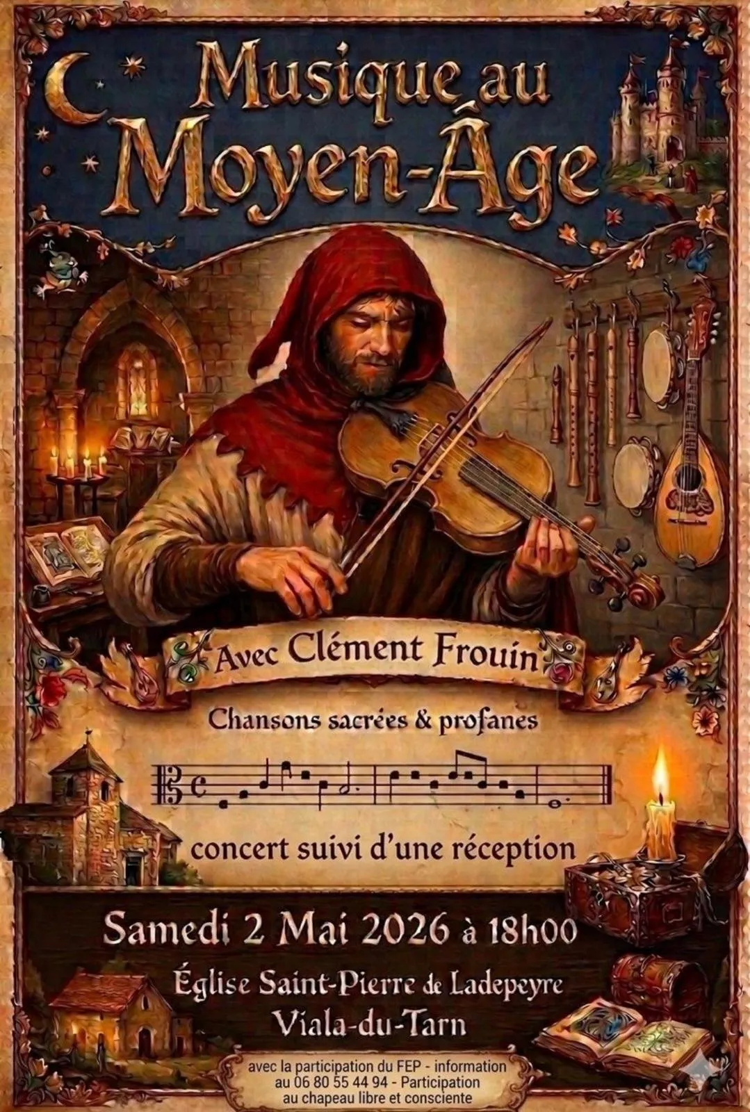 Clément Frouin interprète des chansons sacrées et profanes dans le cadre solennel de l'église Saint-Pierre de Ladepeyre (Viala-du-Tarn). Le concert sera suivi d'une réception organisée avec la participation du FEP.