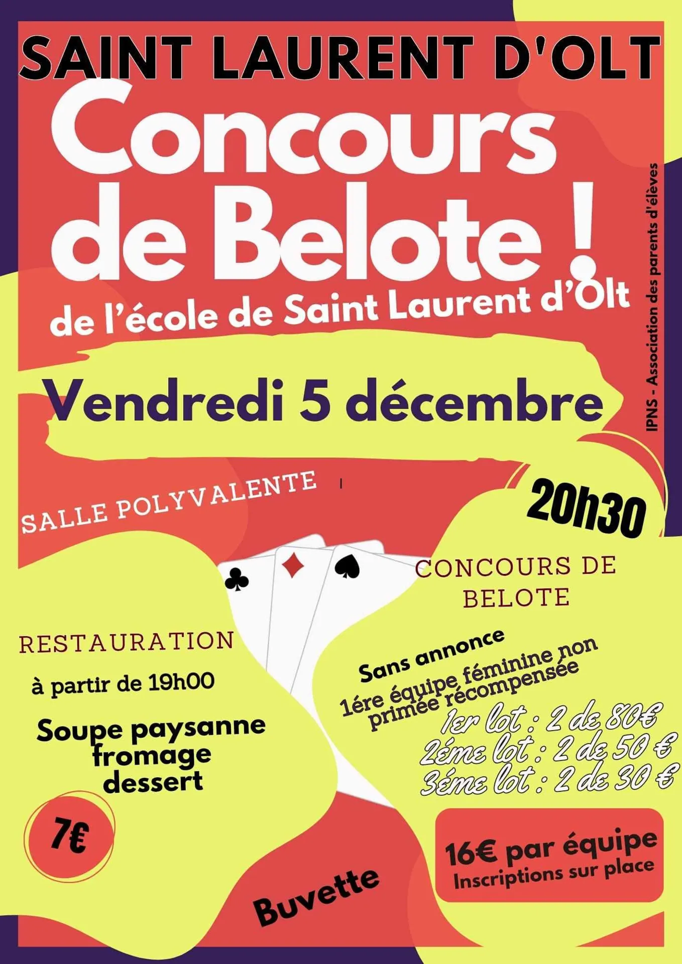 A 20h30, concours de belote. Sans annonce. 1ère équipe féminine non primée récompensée. 1er lot : 2 de 80€, 2eme lot : 2 de 50€, 3ème lot : 2 de 30€.