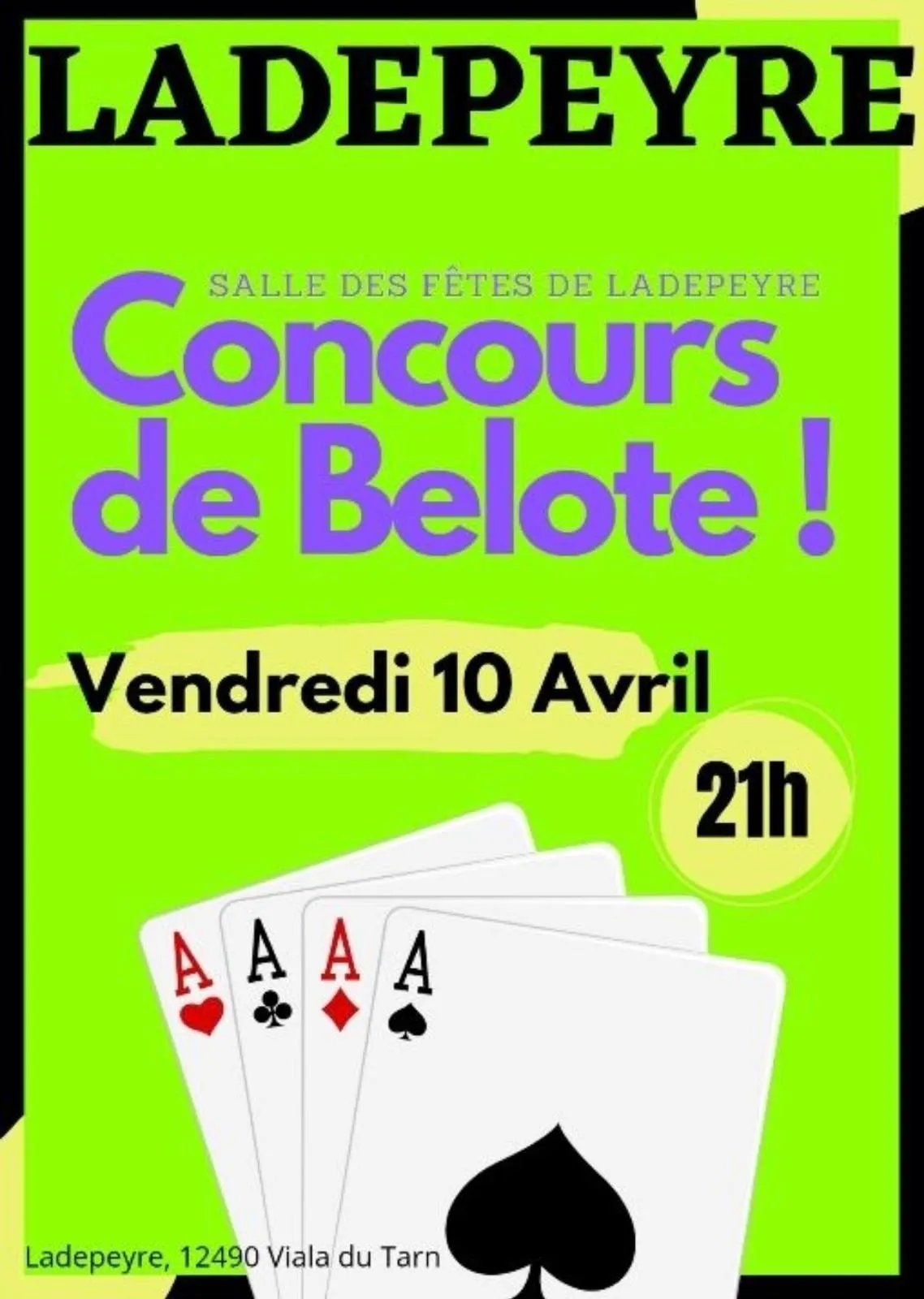 Rendez-vous le vendredi 10 avril à la salle des fêtes de Ladepeyre pour un concours de belote à 21h.