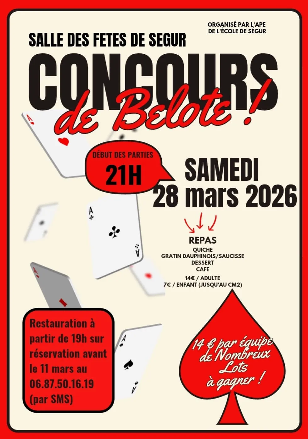 21h - Salle des Fêtes. 14€ par équipe, nombreux lots à gagner. Organisé par l'APE de Ségur. Restauration à 19h sur réservation avant le 11/03 par SMS au 06 87 50 16 19 (quiche, gratin dauphinois saucisse, dessert, café, 14€/ad, 7€/enf (jusqu'au CM2).