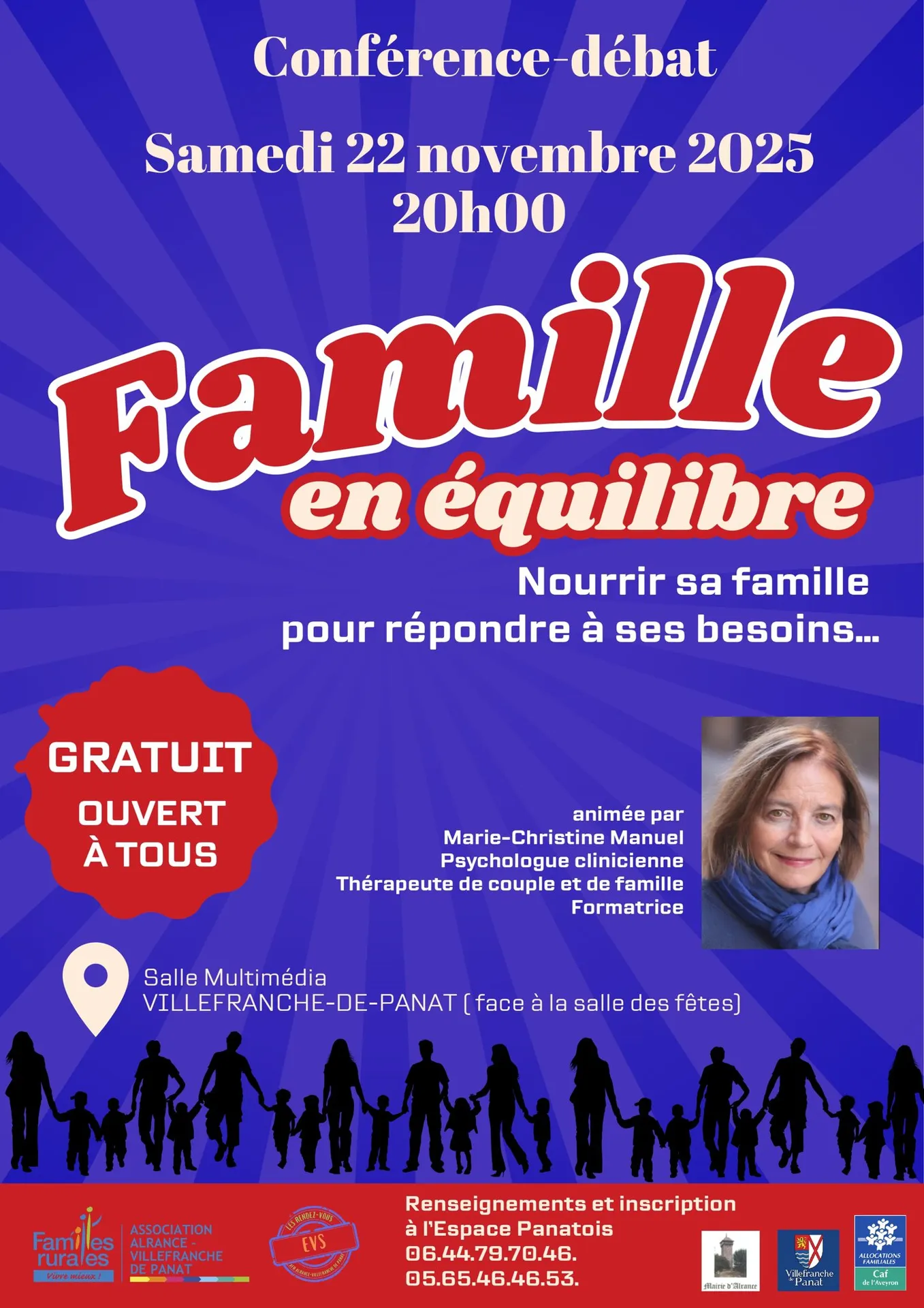 20h00 - Salle Multimédia (face à la salle des fêtes). Conférence - débat "Famille en équilibre, nourrir sa famille pour répondre à ses besoins" animé par Marie-Christine MANUEL psychologue clinicienne, thérapeute. Entrée libre. Infos au 0565464653.