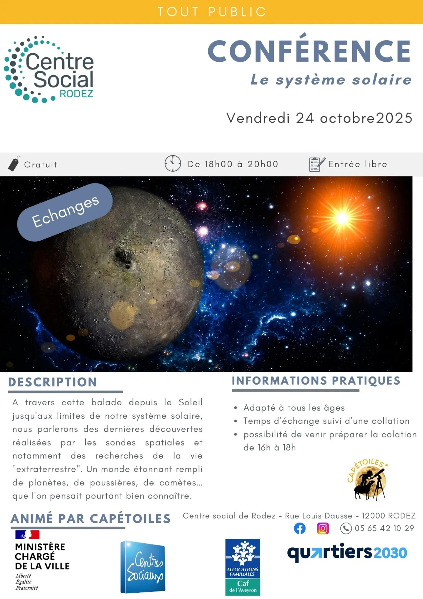 A travers cette balade depuis le Soleil jusqu'aux limites de notre système solaire, nous parlerons des dernières découvertes réalisées par les sondes spatiales et notamment des recherches de la vie "extraterrestre".