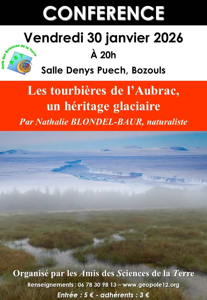 La glaciation du Würm a modelé le paysage de l’Aubrac tout en y laissant de nombreuses traces toujours visibles. Après quelques rappels sur les glaciations qui ont jalonné l’histoire de notre planète, nous nous attarderons sur cette dernière, de l’état des connaissances sur l’englacement de l’Aubrac et sa chronologie aux marques laissées par la calotte glaciaire. Héritage de ce passé glaciaire, les tourbières, nombreuses en Aubrac, sont des milieux de vie particuliers et fragiles. Au travers de l’histoire de leur formation, de leur mode de fonctionnement hydrogéologique, de leur évolution, sans parler de leur flore particulière (plantes insectivores, relictes glaciaires…), nous découvrirons ce que sont vraiment les tourbières et pourquoi il est si important de les protéger, dans le contexte actuel de changement climatique.