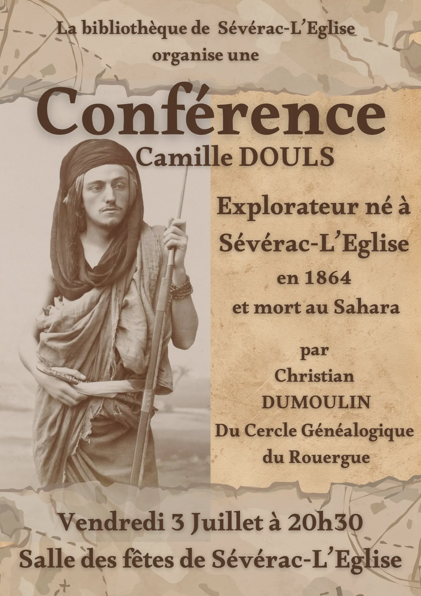 Camille DOULS , est un explorateur aveyronnais , né à Sévérac l’église en 1864 , et mort au Sahara. Venez découvrir sa vie, ses explorations au cours de cette conférence de Christian Dumoulin du Cercle généalogique de l ’Aveyron.