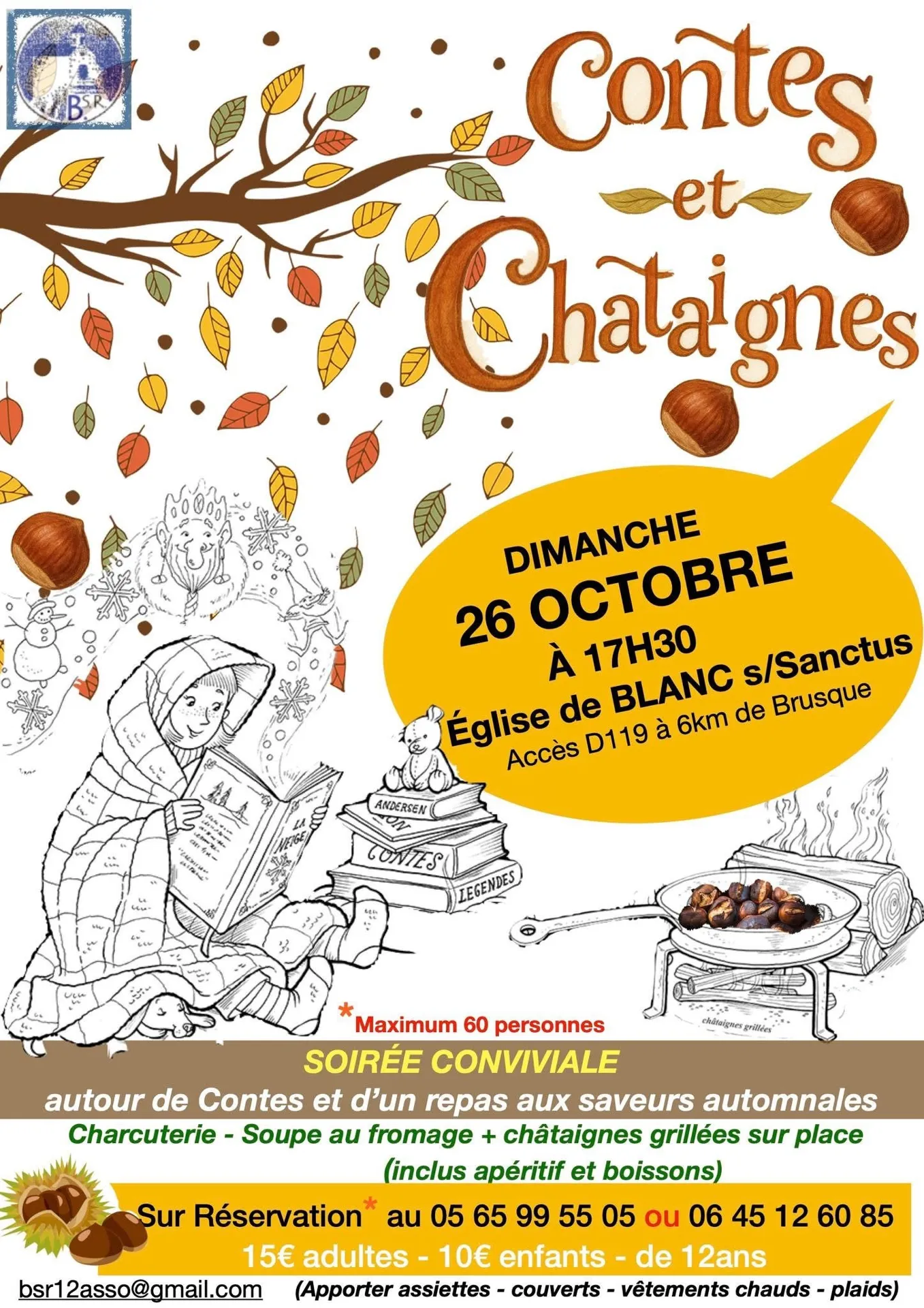 Soirée conviviale aux saveurs de l'automne organisée par l'association "Blanc Sauvegarde Réhabilitation" à l'église de Blanc : repas automnal, soirée contes.