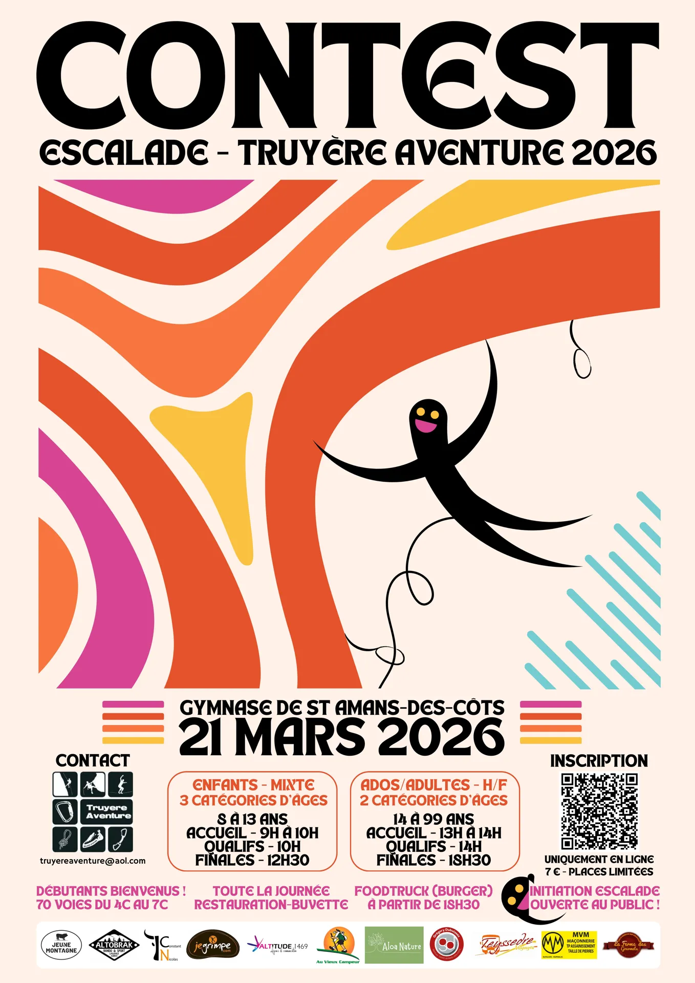 Venez participer au Contest Enfants le matin (3 tranches d’âges entre 8 et 13 ans) ou au Contest Ados et Adultes l'après-midi (à partir de 14 ans). Voici le programme détaillé : Matin : Contest Enfants : Accueil de 9h à 10h > Début des qualifications à 10h00 > Finales à 12h30 et podiums pour 3 tranches d'âges : 8-9 ans, 10-11 ans et 12-13 ans ;Après-midi : Compétition Ados & Adultes : Accueil de 13h à 14h > Début des qualifications à 14h00 > Finales à 18h30 et podiums pour 2 tranches d'âges (14-16 ans et 17-99 ans), chacune différenciée par catégorie de genre (H/F) ;Une initiation escalade sera ouverte au public ;Saut pendulaire et grimpe libre en soirée ;Buvette-Snack ouverte toute la journée (sandwichs, dahl végétarien, crêpes, boissons) ;Restauration Food Truck pour la soirée à partir de 18h30. Les inscriptions se font exclusivement en ligne jusqu’à la veille du contest, au tarif de 7€ par personne via ce lien :