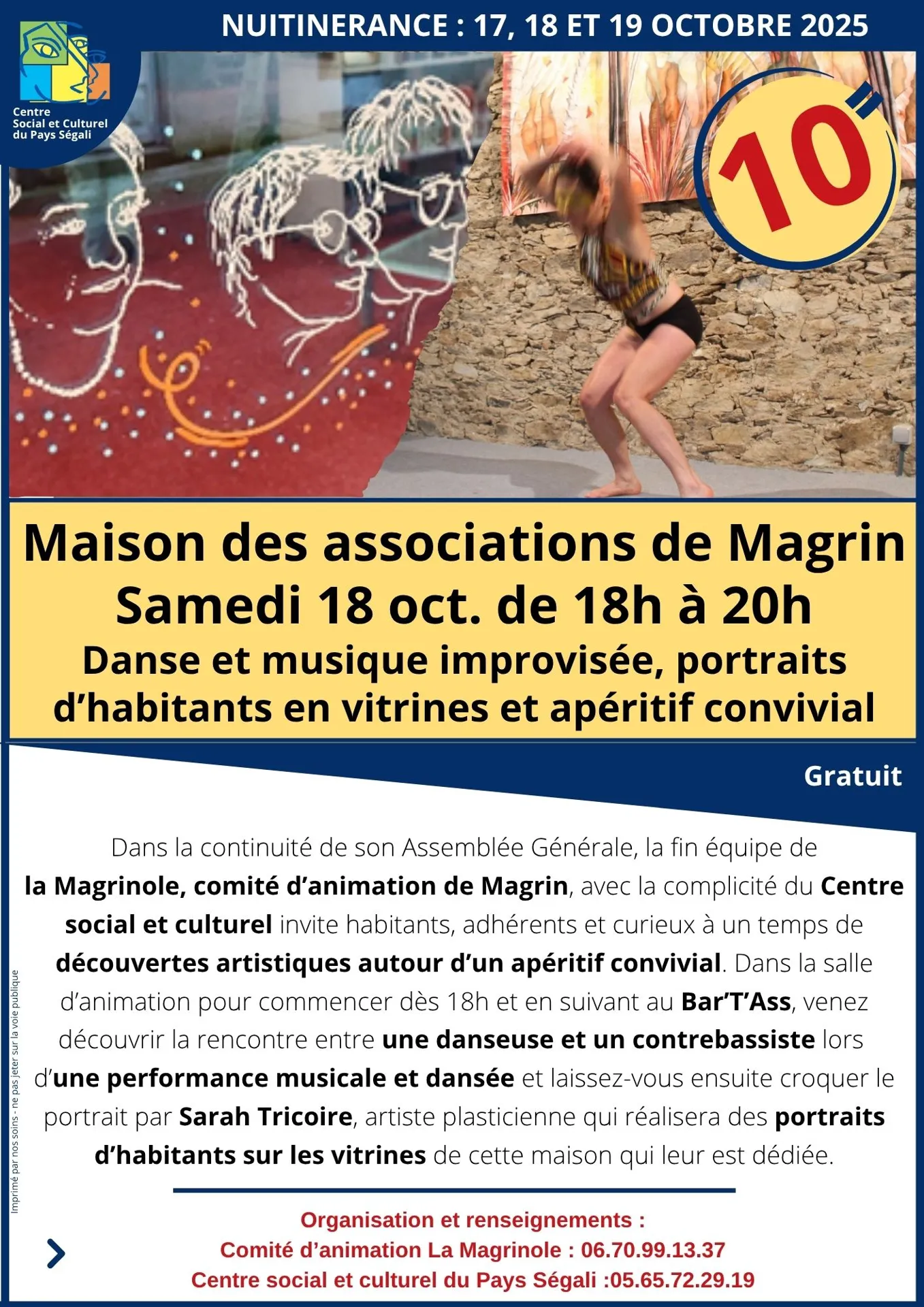 Dans la continuité de son Assemblée Générale, la fine équipe de la Magrinole, comité d’animation de Magrin, avec la complicité du Centre social et culturel invite habitants, adhérents et curieux à un temps de découvertes artistiques autour d’un apéritif convivial.Dans la salle d’animation pour commencer dès 18h et en suivant au Bar’T’Ass, venez découvrir la rencontre entre une danseuse et une contrebassiste lors d’une performance musicale et dansée et laissez-vous croquer le portrait par Sarah Tricoire, artiste plasticienne qui réalisera des portraits d’habitants sur les vitrines de cette maison qui leur est dédiée.