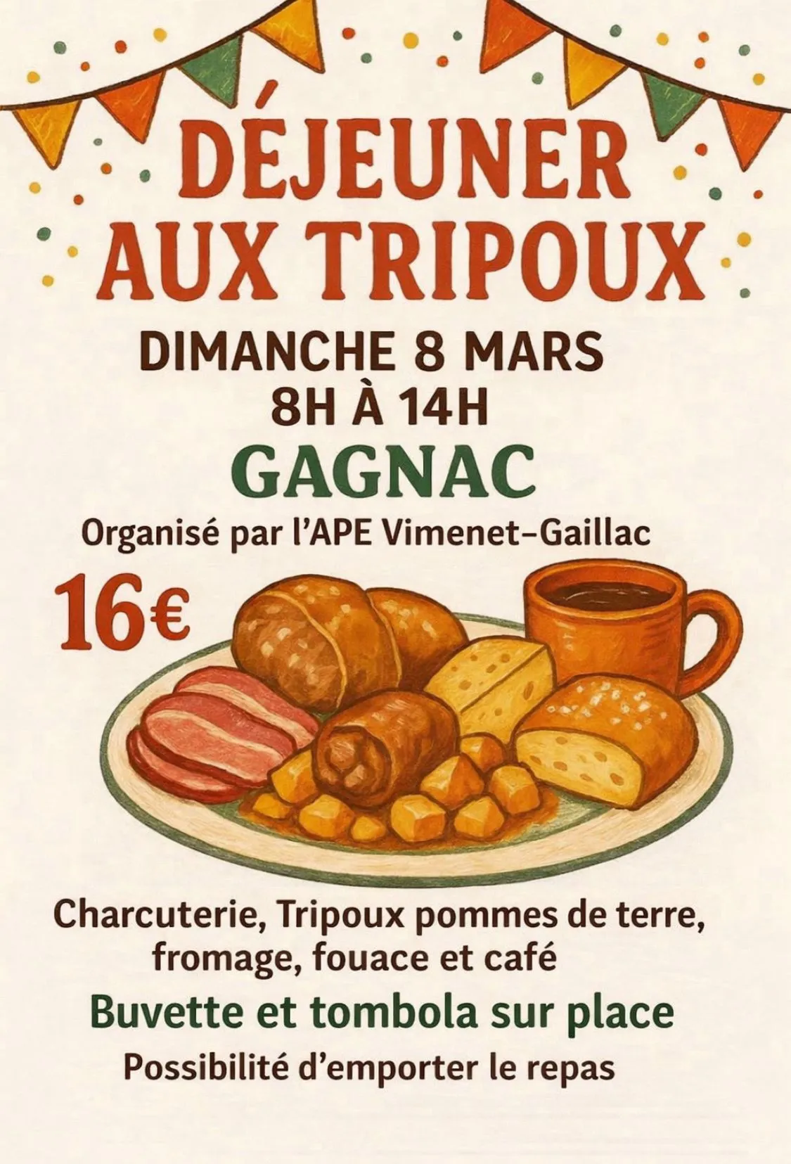 L'APE de Vimenet-Gaillac organise un déjeuner aux tripoux à partir de 8h à la salle des fêtes de Gagnac.
