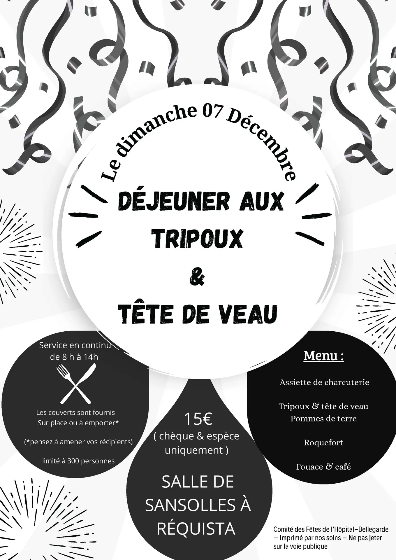 En service continu sur place ou à emporter (pensez à amener vos couverts) à la salle de Sansolles COMITÉ DES FÊTES DE L'HOPITAL BELLEGARDE de 8h à 14h, service continu. Tél. 06 88 52 12 44. Limité à 300 pers.Menu 15 € : Assiette de charcuterie - Tripoux et tête de veau – Pommes de terre – Roquefort – Fouace – Café et vin.POSSIBILITÉ DE PRENDRE A EMPORTER EN AMENANT SES BOITES OU PLATS