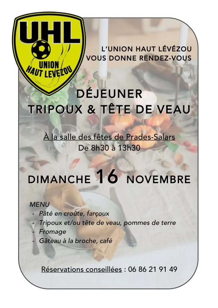 8h30 à 13h30 - Salle des fêtes. Organisé par le club de foot UHL. Menu : pâté en croûte, farçous / tripoux ou tête de veau / fromage / gâteau à la broche / café. Réservations conseillées au 06 86 21 91 49.