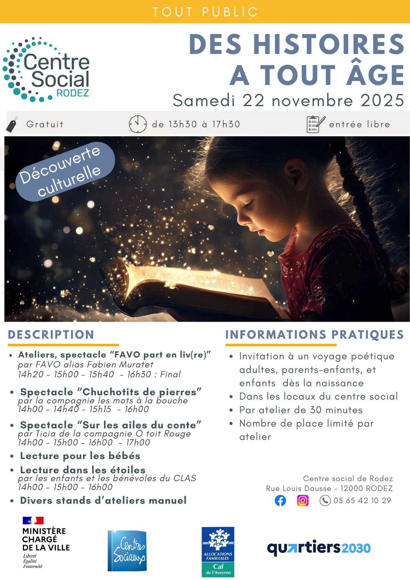 Des ateliers ouverts à tous, avec des spectacles d’histoires pour petits et grands !