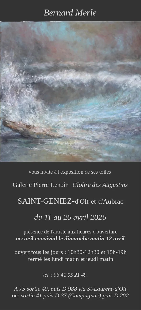 Exposition de Bernard Merle à Saint Geniez d’Olt et d’Aubrac12130 Saint-Geniez-d'Olt-et-d'Aubrac lat. 44.4658 - lon. 2.9726