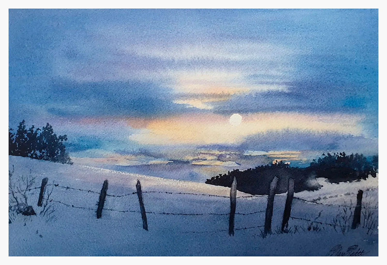 « Je ne cherche pas à restituer fidèlement un sujet, mais à en traduire une sensation, une atmosphère. À travers l’aquarelle, j’explore les transparences, les superpositions de teintes et les variations de lumière pour créer des paysages sensibles, parfois légèrement décalés. »