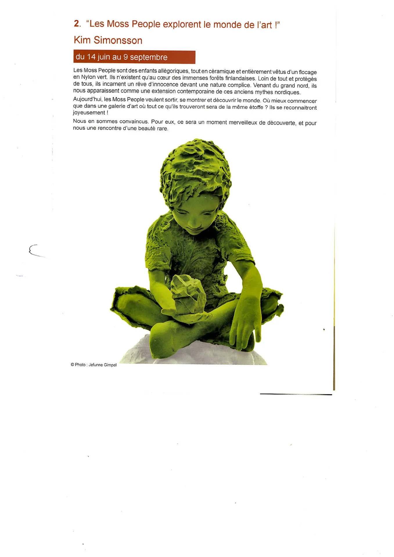 Les Moss People sont des enfants allégoriques tout en céramique et entièrement vêtus d'un flocage en nylon vert. Ils n'existent qu'au coeur des immenses forêts finlandaises. Loin de tout et protégés de tous, ils incarnent un rêve d'innocence devant une nature complice. Venant du grand nord, ils nous apparaissent comme une extension contemporaine des ces anciens mythes nordiques.