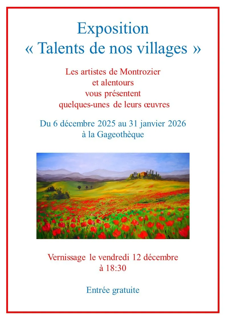 L'exposition "Talents de nos villages" arrive à la Gageothèque : du samedi 6 décembre 2025 au samedi 31 janvier 2026, notre médiathèque accueillera des œuvres d'art d'habitants de Montrozier et alentours. Vous pourrez y déambuler parmi des peintures, des tableaux de "string art", de la maroquinerie, des poésies... C'est là l'occasion de découvrir les talents nichés dans notre commune.