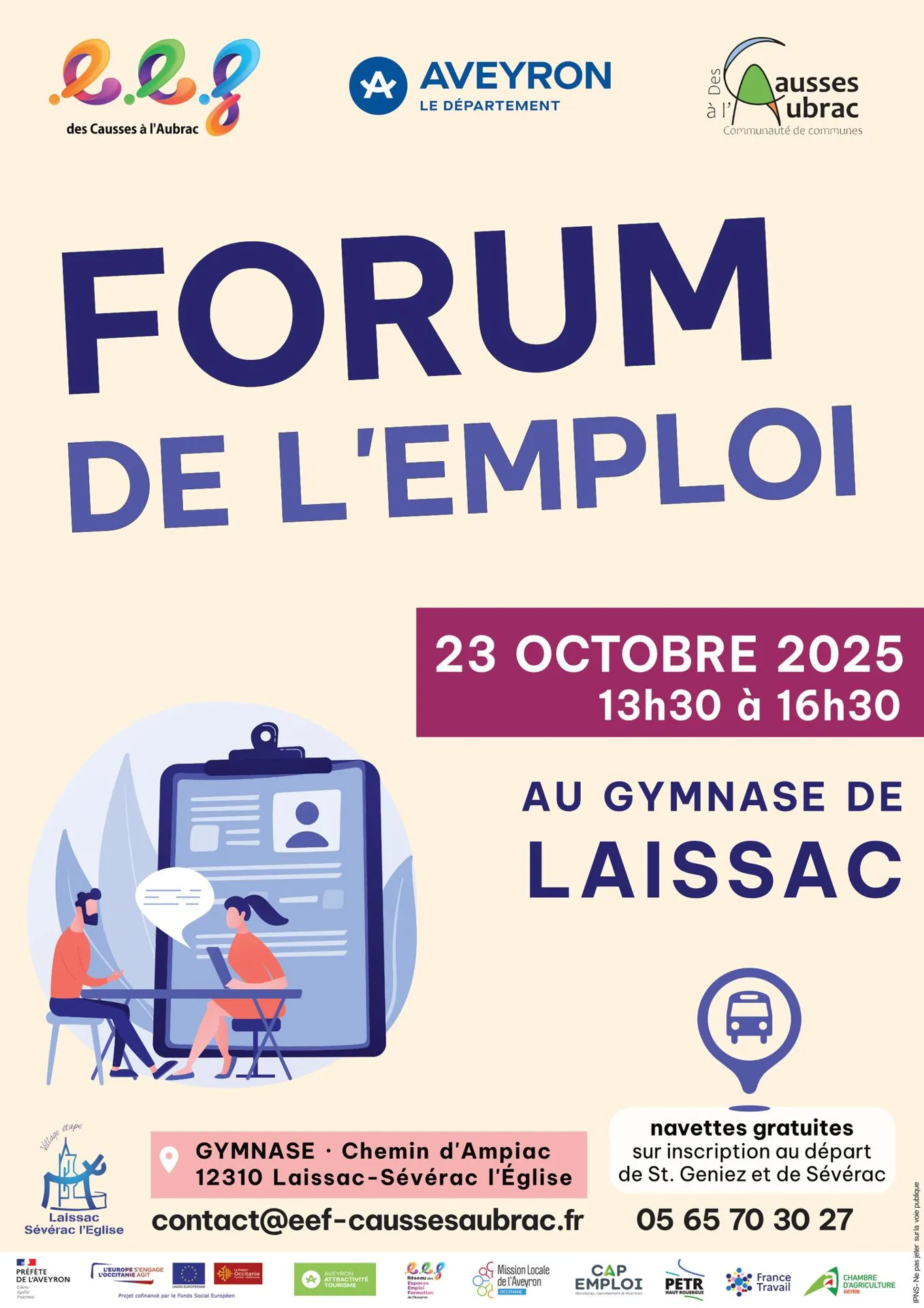 Forum de l'emploi de 13h30 à 16h30 au gymnase de Laissac. Navettes gratuites sur inscription au départ de St Geniez et de Sévérac.