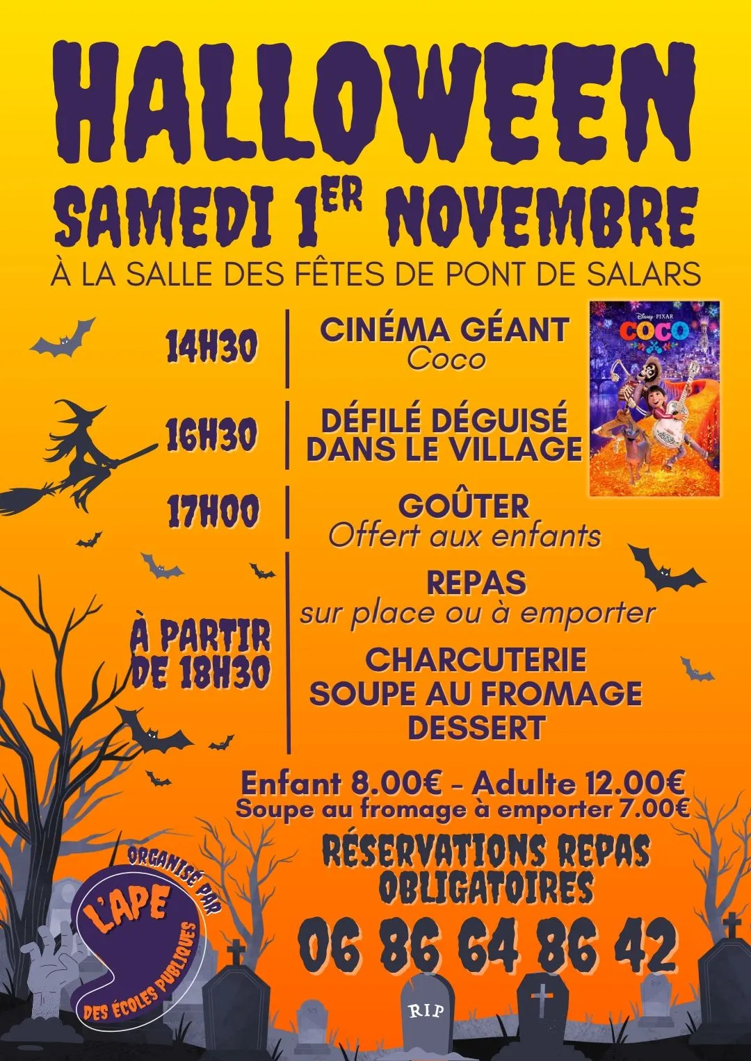 14h30 - Salle des Fêtes. Projection du film Coco. 16h30 défilé déguisé dans le village et goûter offert aux enfants. Repas charcuterie soupe au fromage dessert 8€ enf/12€ adulte, sur place ou emporter. Résa obligatoire au 06 86 64 86 42.