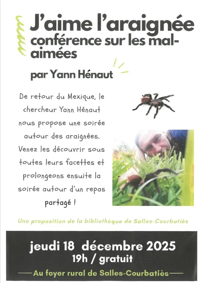 De retour du Mexique, le chercheur Yann Hénaut nous propose une soirée autour des araignées. Venez les découvrir sous toutes leurs facettes et prolongeons ensuite la soirée autour d'un repas partagé.