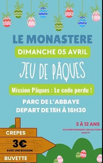 Jeu de Pâques :DIMANCHE 05 - PARC DE L’ABBAYE - 15H/16H30Petits explorateurs et grands gourmands, êtes-vous prêts pour une aventure pleine de surprises ?