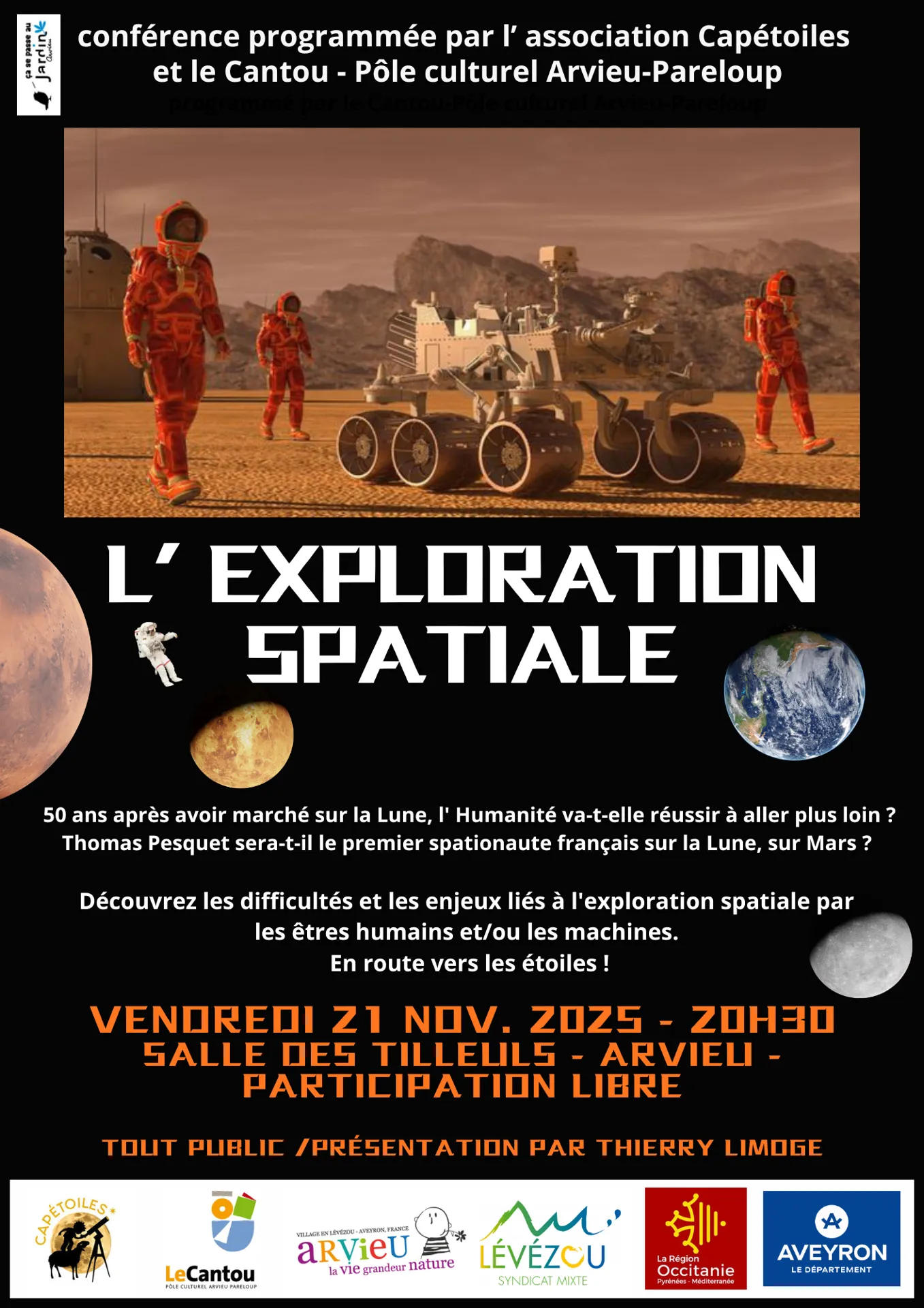 20h30 - Salle des Tilleuls. Découvrez les enjeux et difficultés liés à l'exploration spatial. Présentation par Thierry LIMOGE de l'Association Capétoiles. Participation libre. Info au Cantou 05 65 46 06 06.