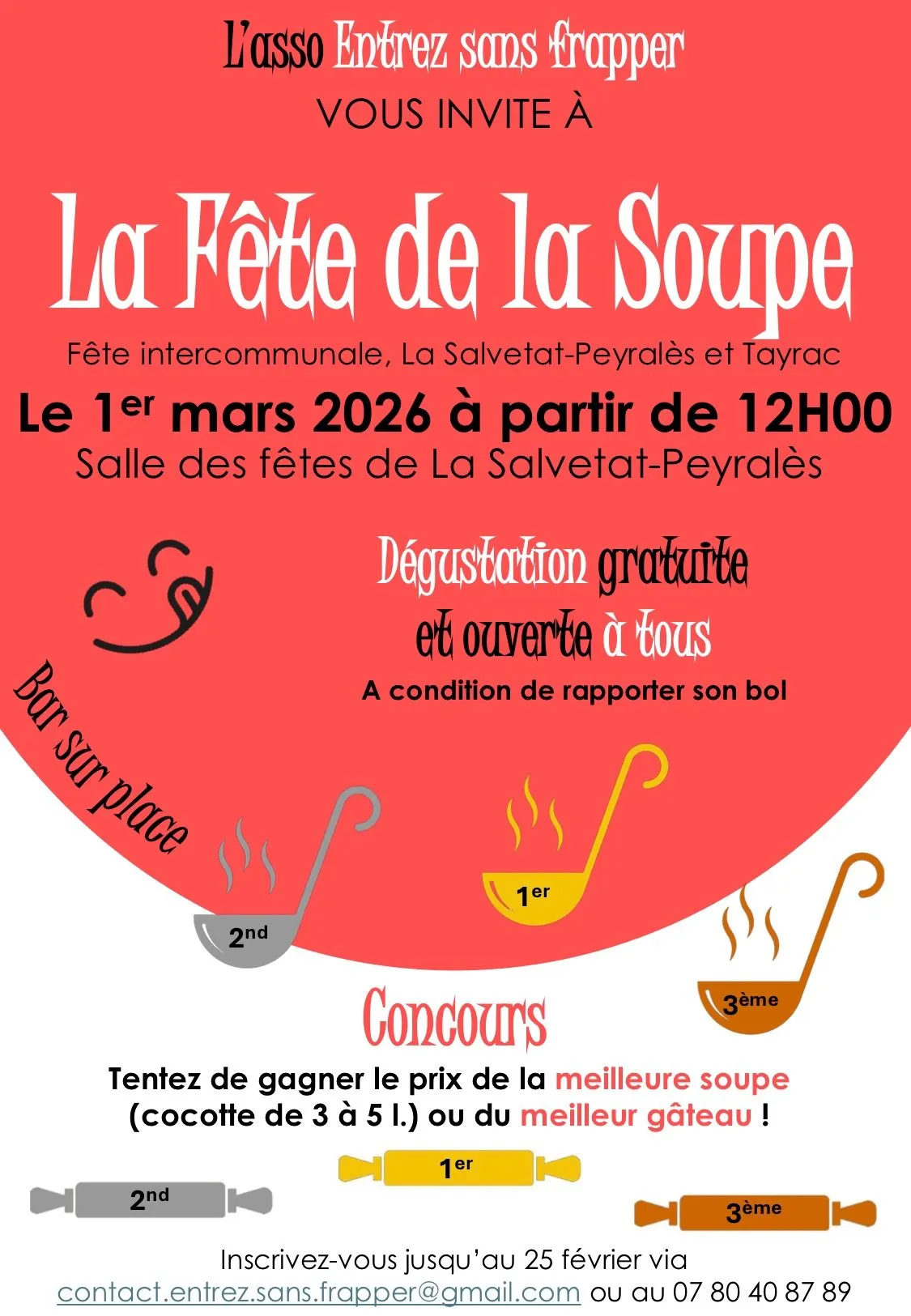 concours de la meilleure soupe ( dans une cocotte de 3 à 5 litres) et du meilleur gâteau. Inscriptions jusqu'au 25 février .