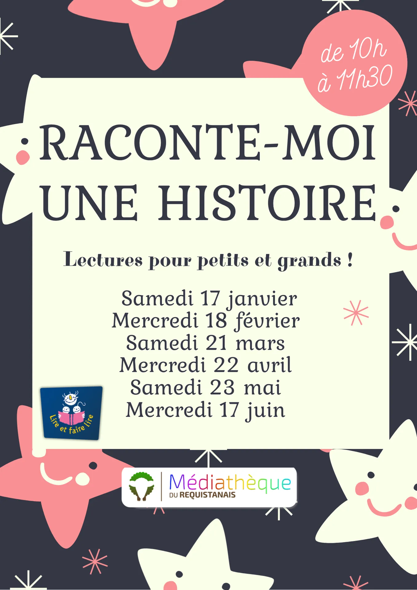 De 10h à 11h30 : lectures d’histoires pour petits et grands en partenariat avec l’Association " Lire et Faire Lire ". Tout public – Accès libre.
