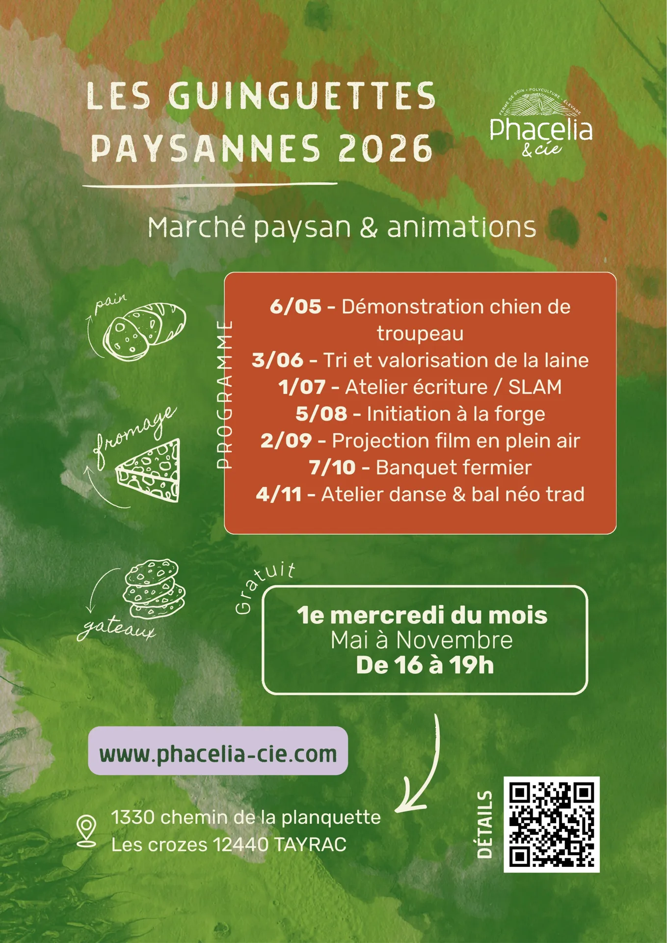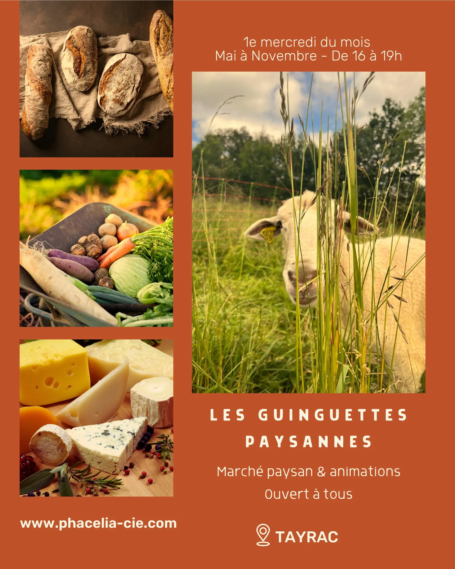 Chaque premier mercredi du mois, les guinguettes paysannes s’organisent à Tayrac, au sein de la ferme Phacelia & cie : un marché de producteurs locaux et des animations gratuites ouvertes à tous. Un repas de clôture est proposé à prix libre.